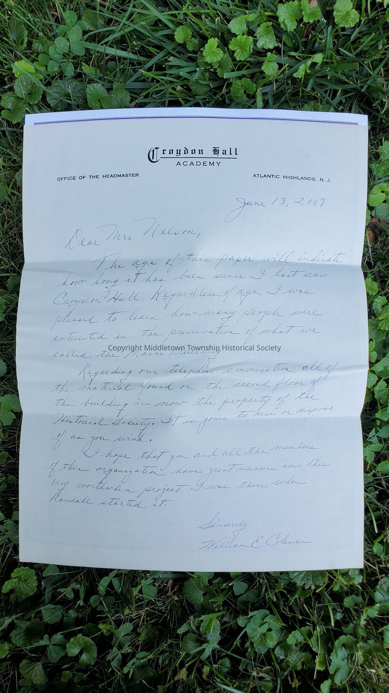 2007 letter from former Croydon Hall Headmaster William E. Coleman to the Gail Nelsen, Treasurer of Middletown Township Historical Society. Letter states that the items on the 2nd floor of the MacLeod Rice Mansion now belong to the Society (after the passing of Mrs. Carr, a tenant who had life rights). Also includes death certificate of Mrs. Carr.Acquisition