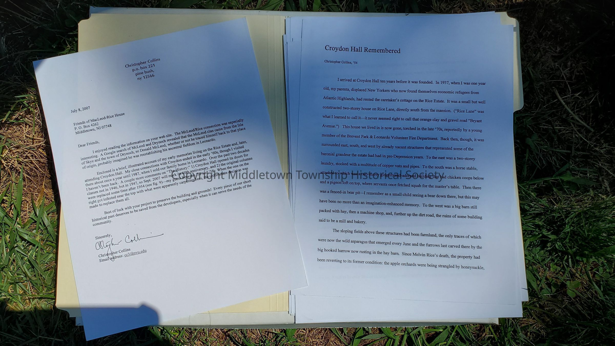 2007 memoir by Christopher Collins, born in 1936, who lived on the Rice estate as a young child and later attended school there at Croydon Hall. Includes copies of photos and interesting reminiscences. Mr. Collins became a professor at NYU and an author.Acquisition