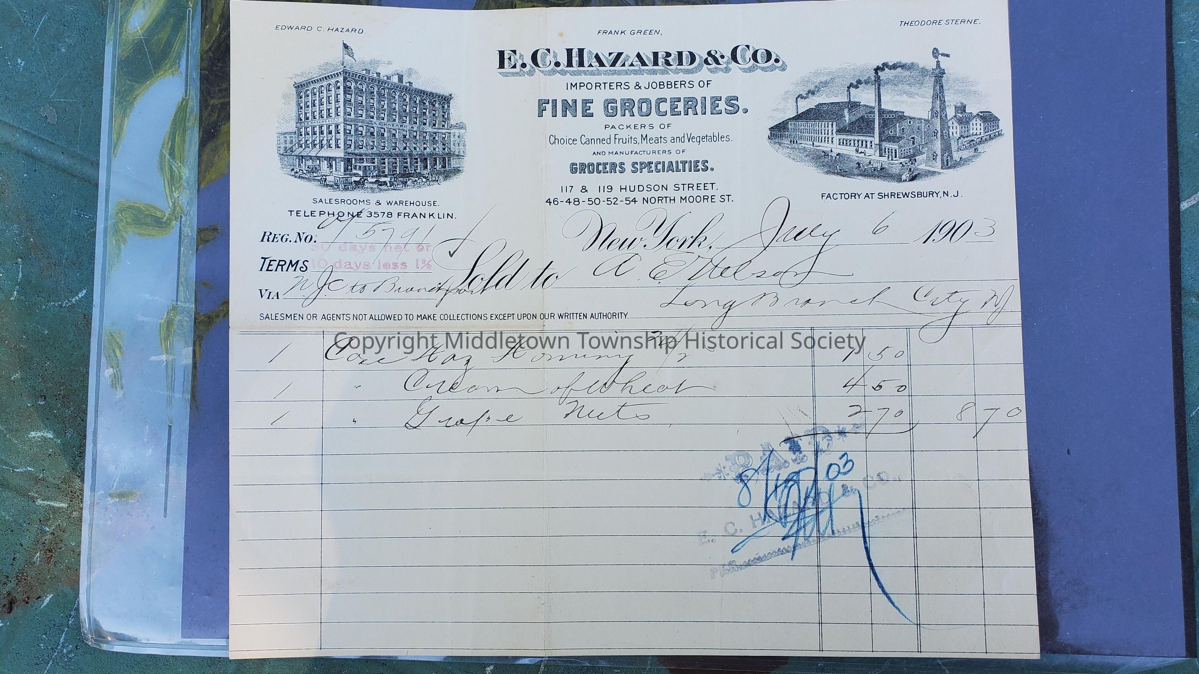 1903 receipt from E.C. Hazard & Company, ketchup and food manufacturer in Shrewsbury. 1903. 8.5" x 7".Made/Created