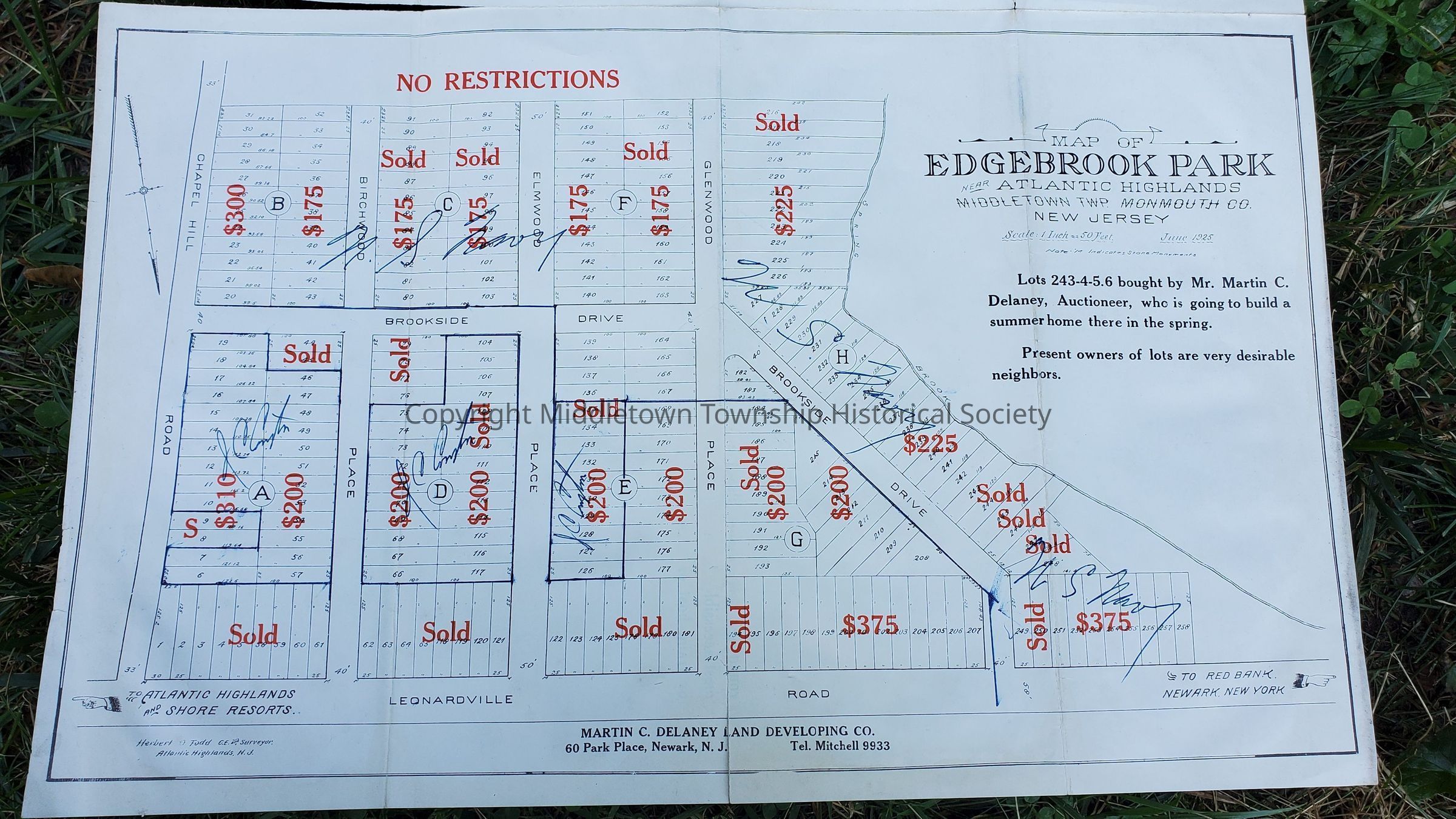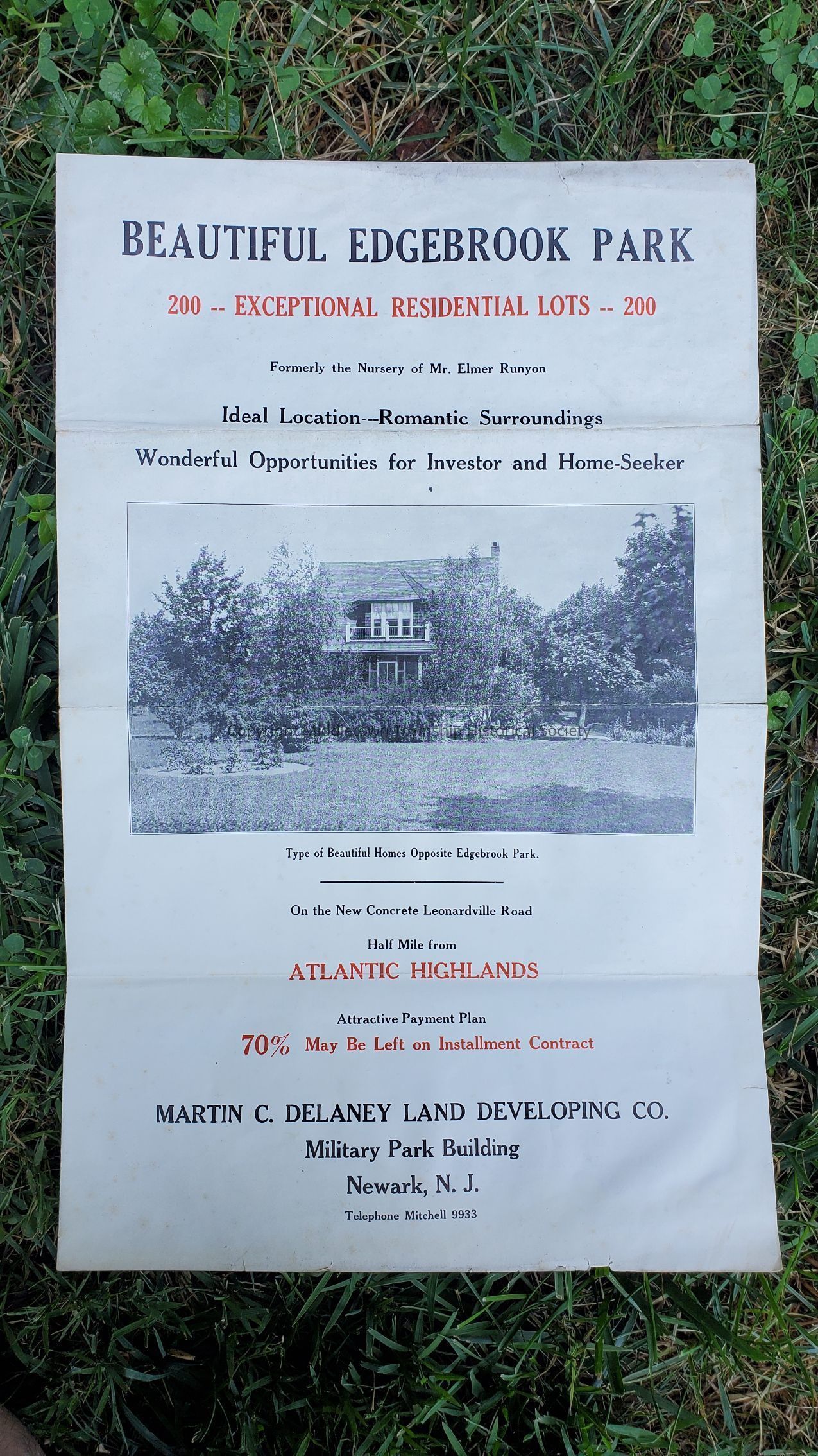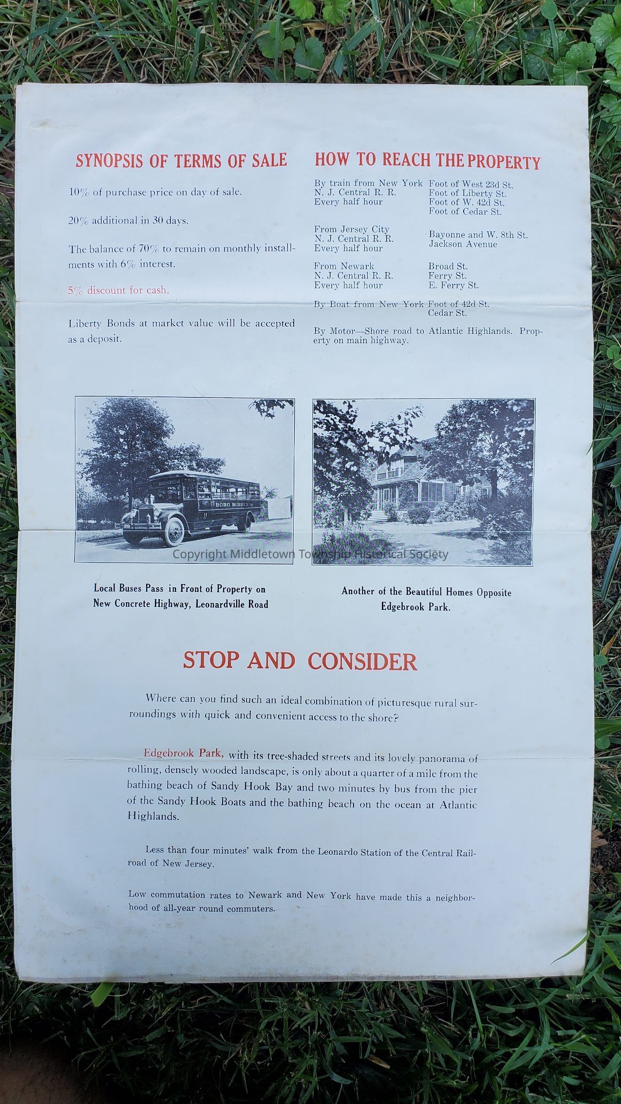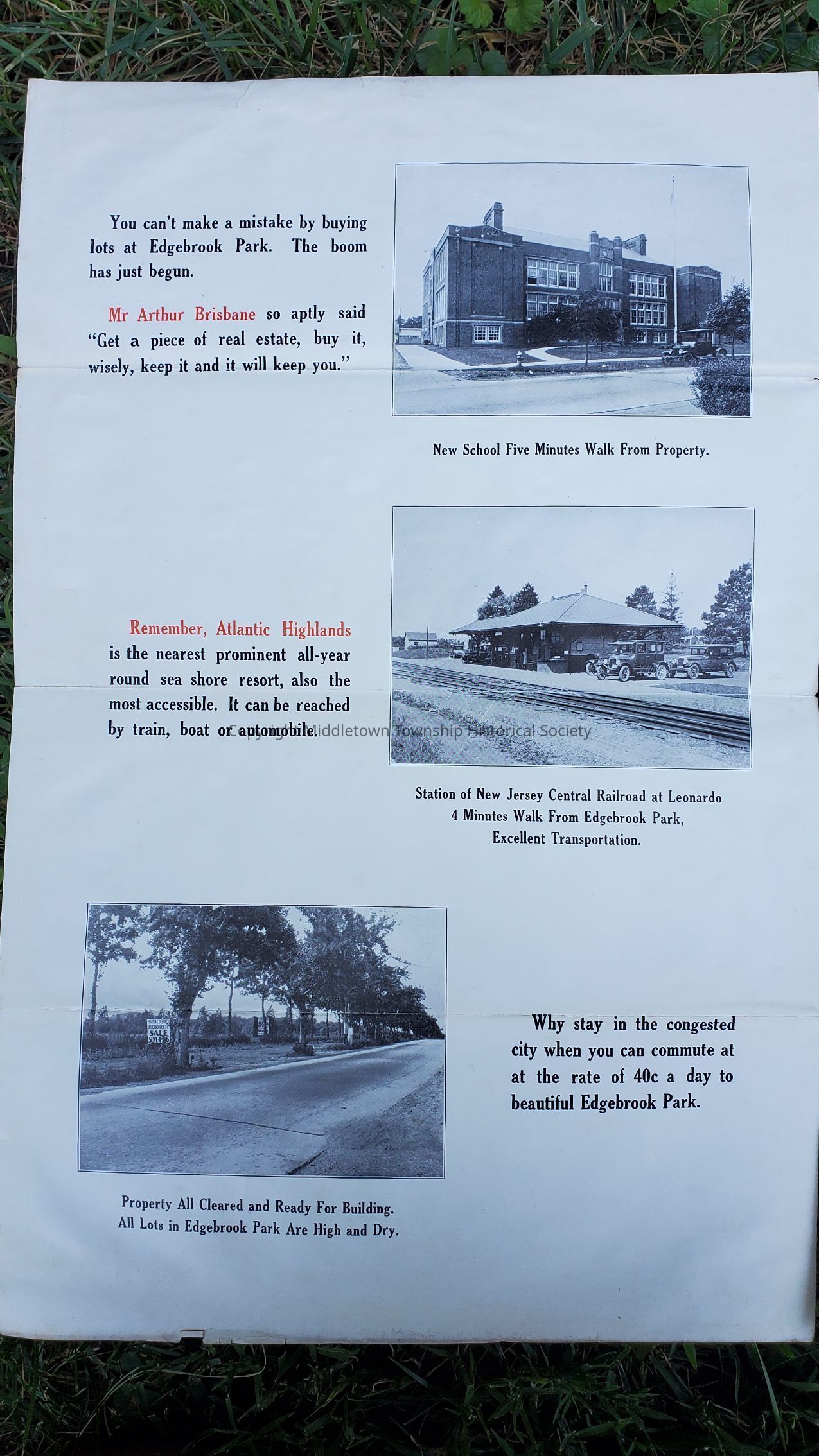 1926 brochure for the development on Leonardville Road between Brookside Drive and Chapel Hill Road. Former nursey or Elmer Runyon. Photos of Middletown Township High school, Leonardo train station.Acquisition