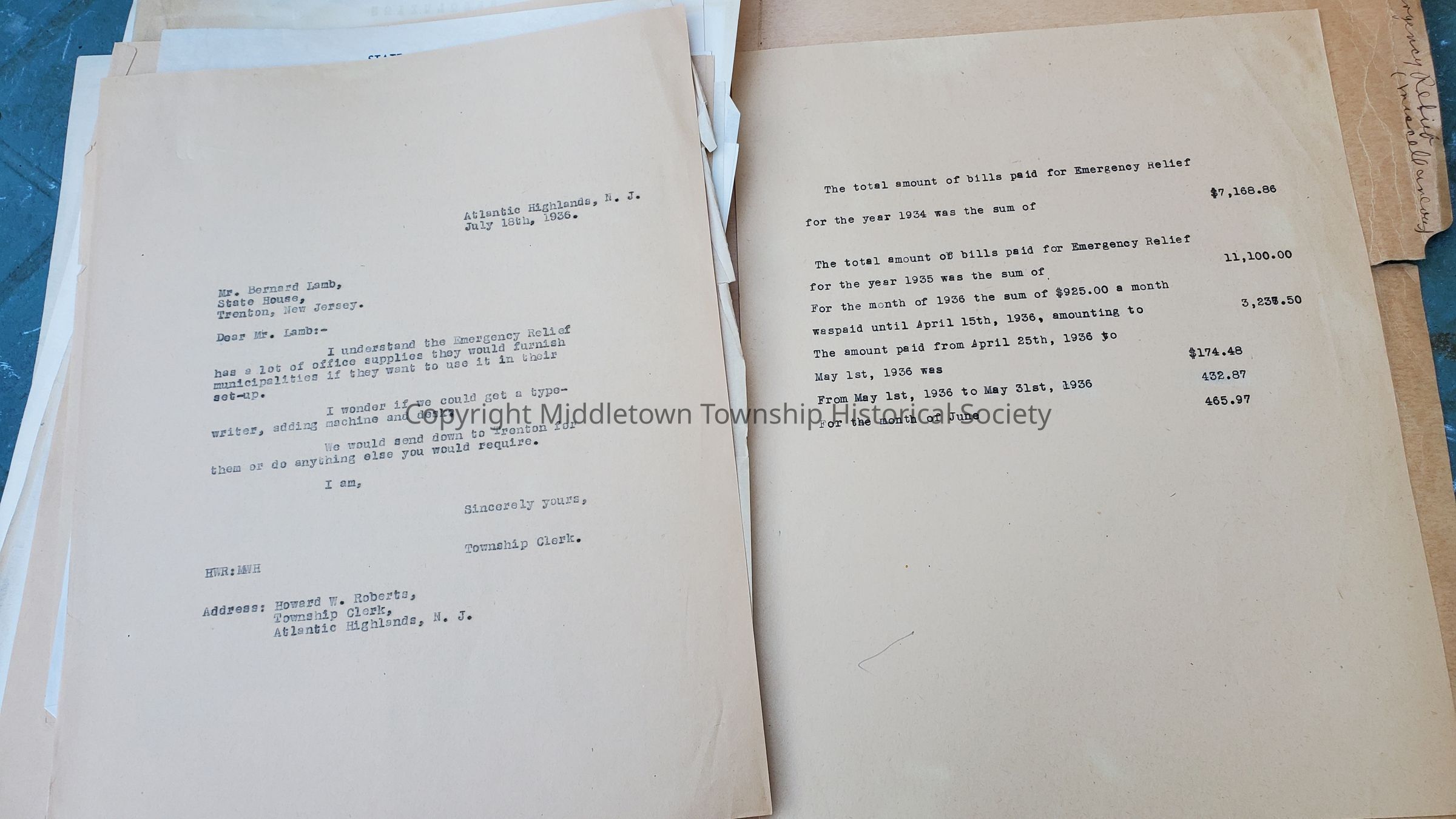 Letters from 1935 and 1936 concerning the town obtaining funds from the federal Emergency Relief Administration (soon to be replaced by the Works Progress Administration), designed to ease unemployment during the Great Depression.Acquisition