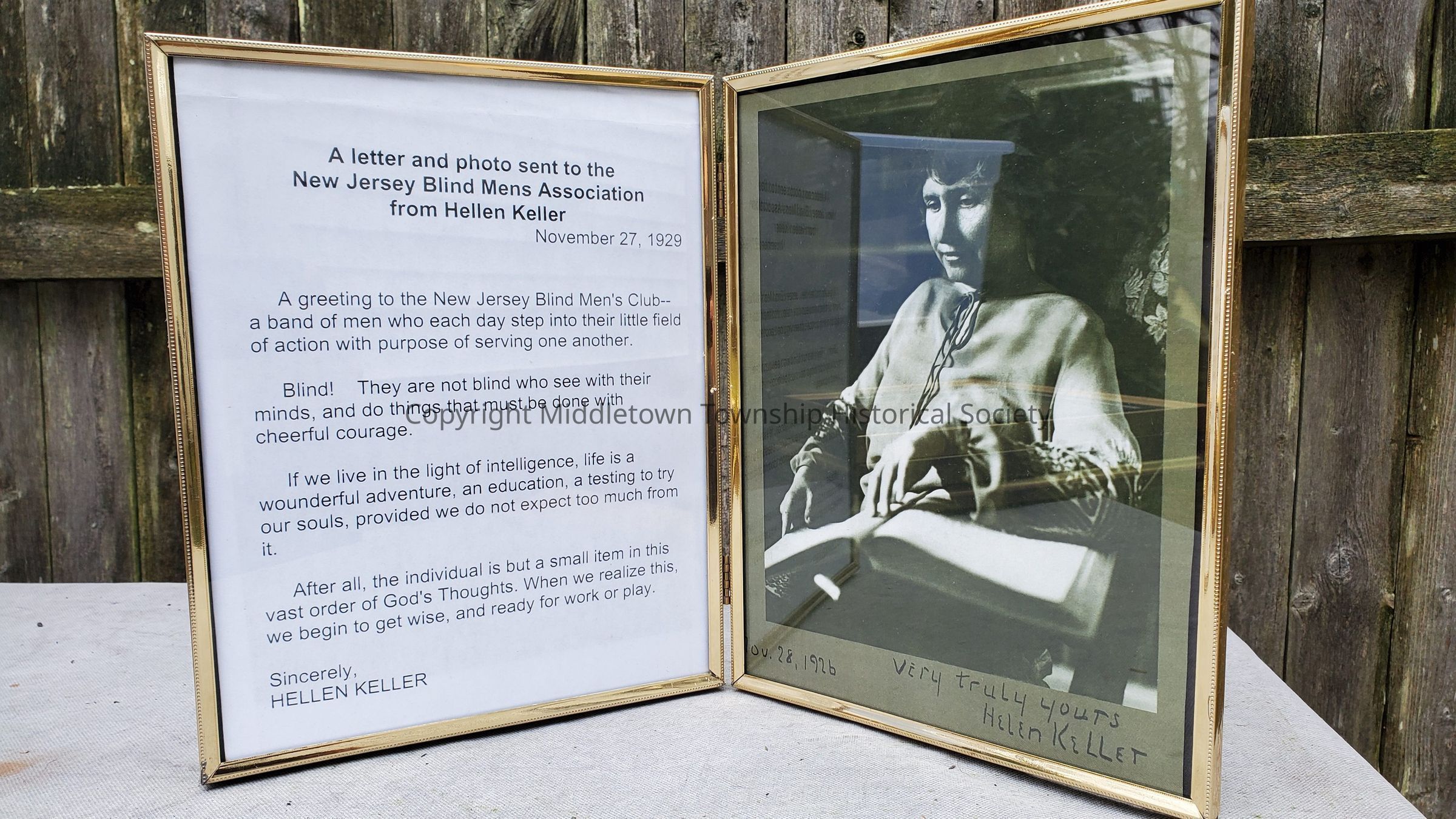 A copy of a Helen Keller photo and letter given to the NJ Blind Men's Association in 1926. Framed.Acquisition