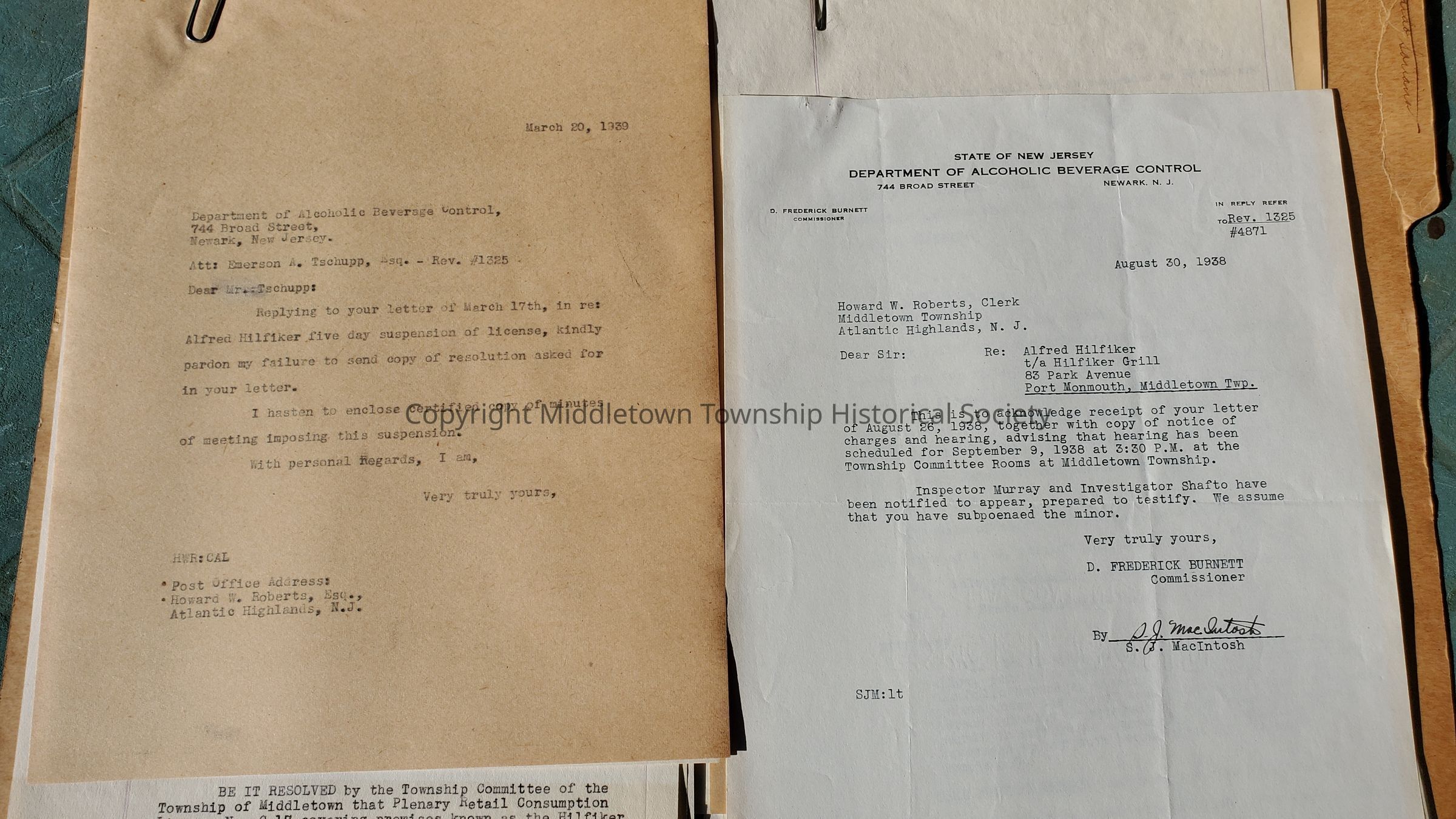 Documents from 1938 concerning Alfred Hilfiker's arrest and subsequent penalty for serving alcohol to underage Alice Almind at his Hilfiker Grill (later known as Sportsman's Bar), located at 83 Park Avenue in Port Monmouth. Hilfiker was a Swiss native who died in 1955.Acquisition