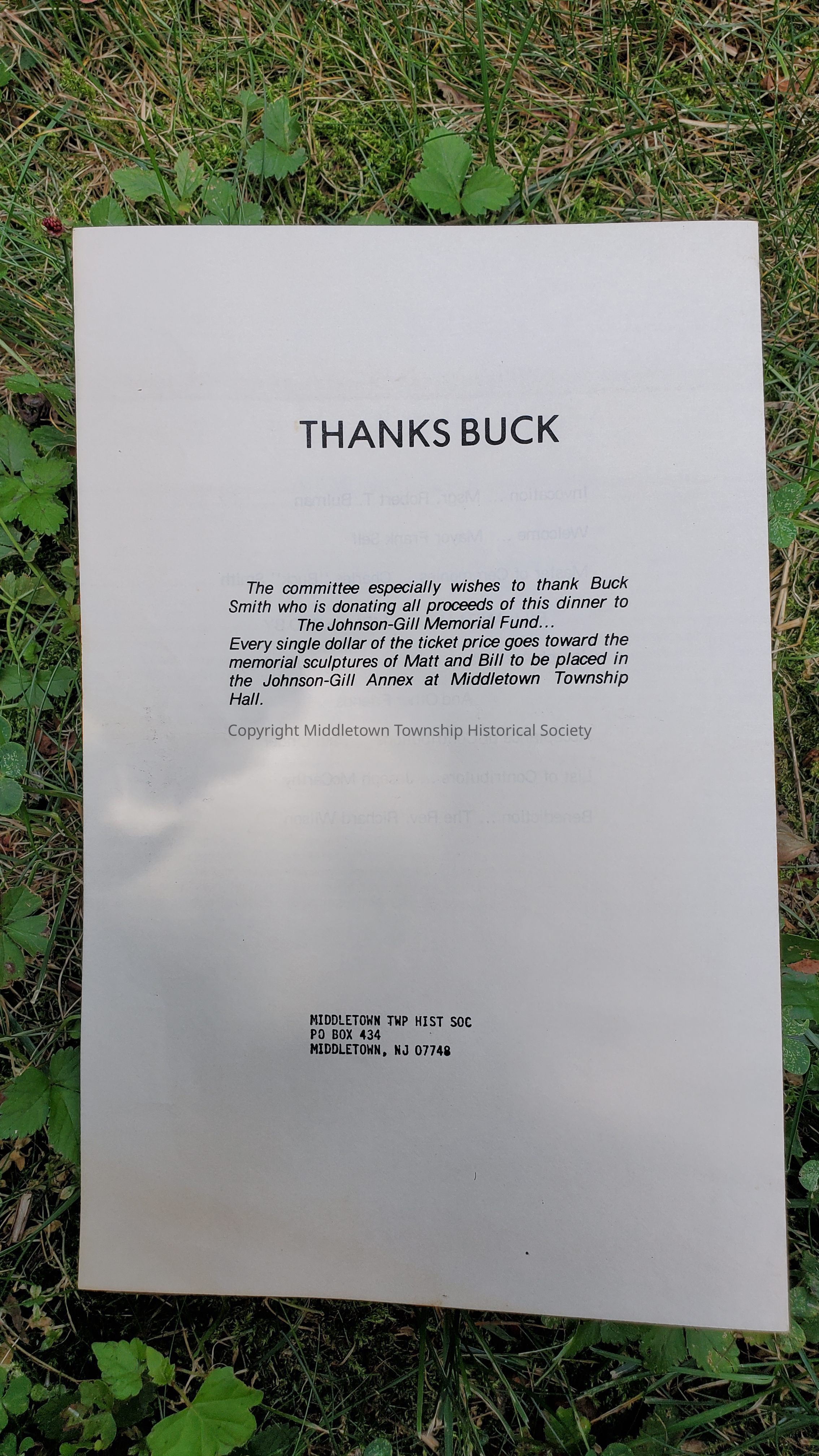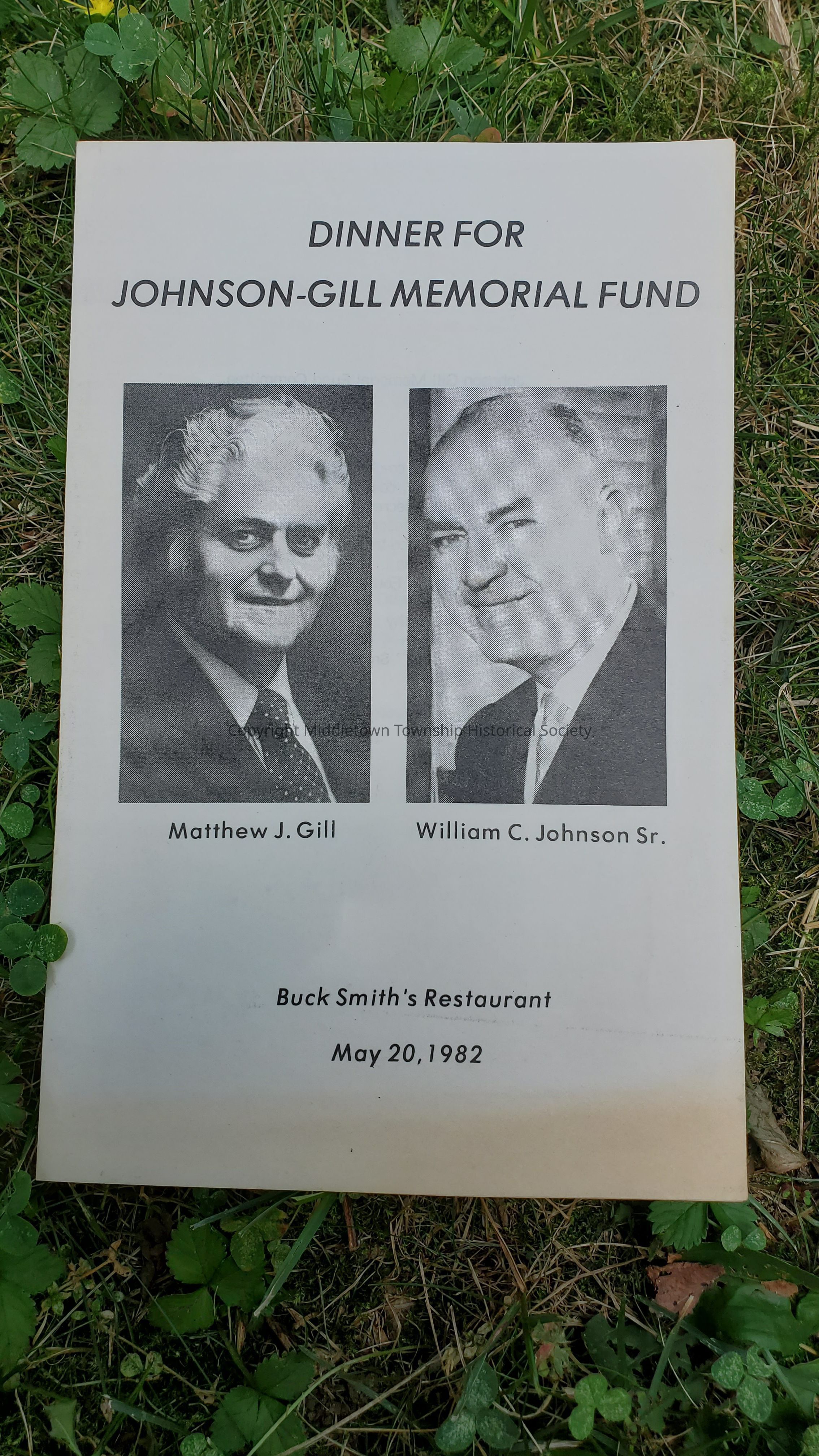 Dinner program from a Johnson-Gill Memorial Fund event held at Bucky Smith's Restaurant in East Keansburg on May 20, 1982. The fund was created to pay for busts of William John and Matthew Gill by the artist Donald DeLue, which were placed inside the Johnson-Gill Annex of Middletown.
