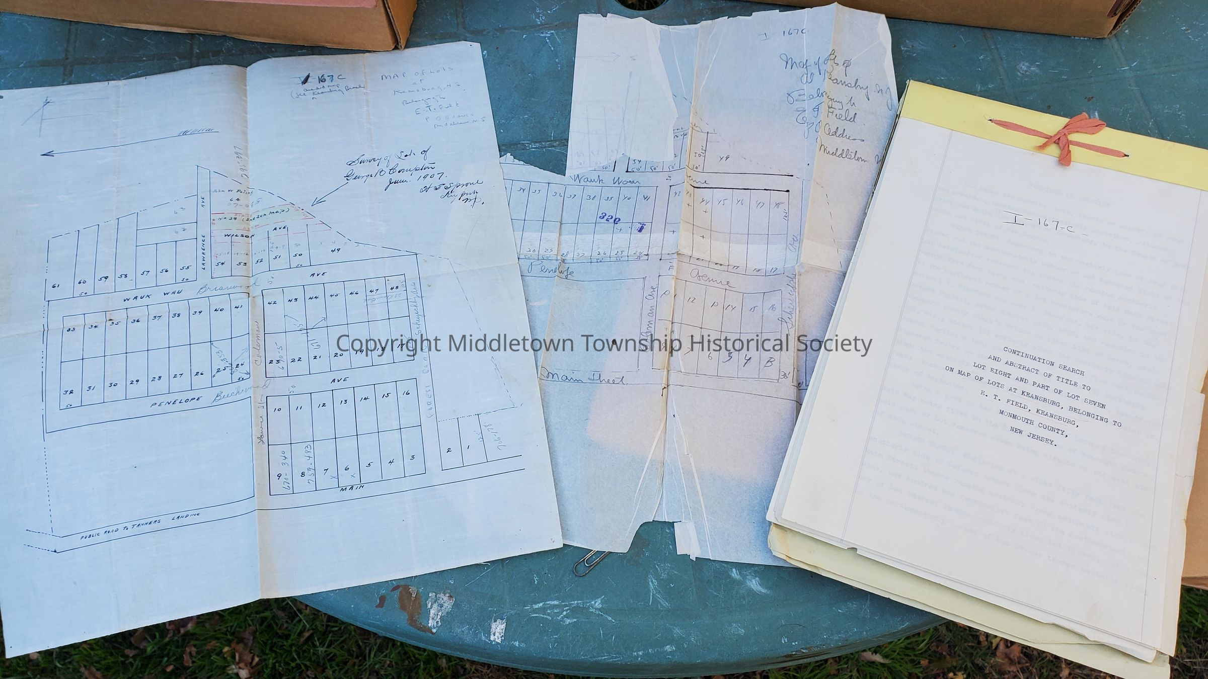 Map from 1907 and title search concerning lots in today's Keansburg (then Middletown) owned by Elnathan T. Field. In the map, today's Beechwood Avenue is named Penelope Avenue, and Briarwood Avenue is named Wauk Wau Avenue.Acquisition