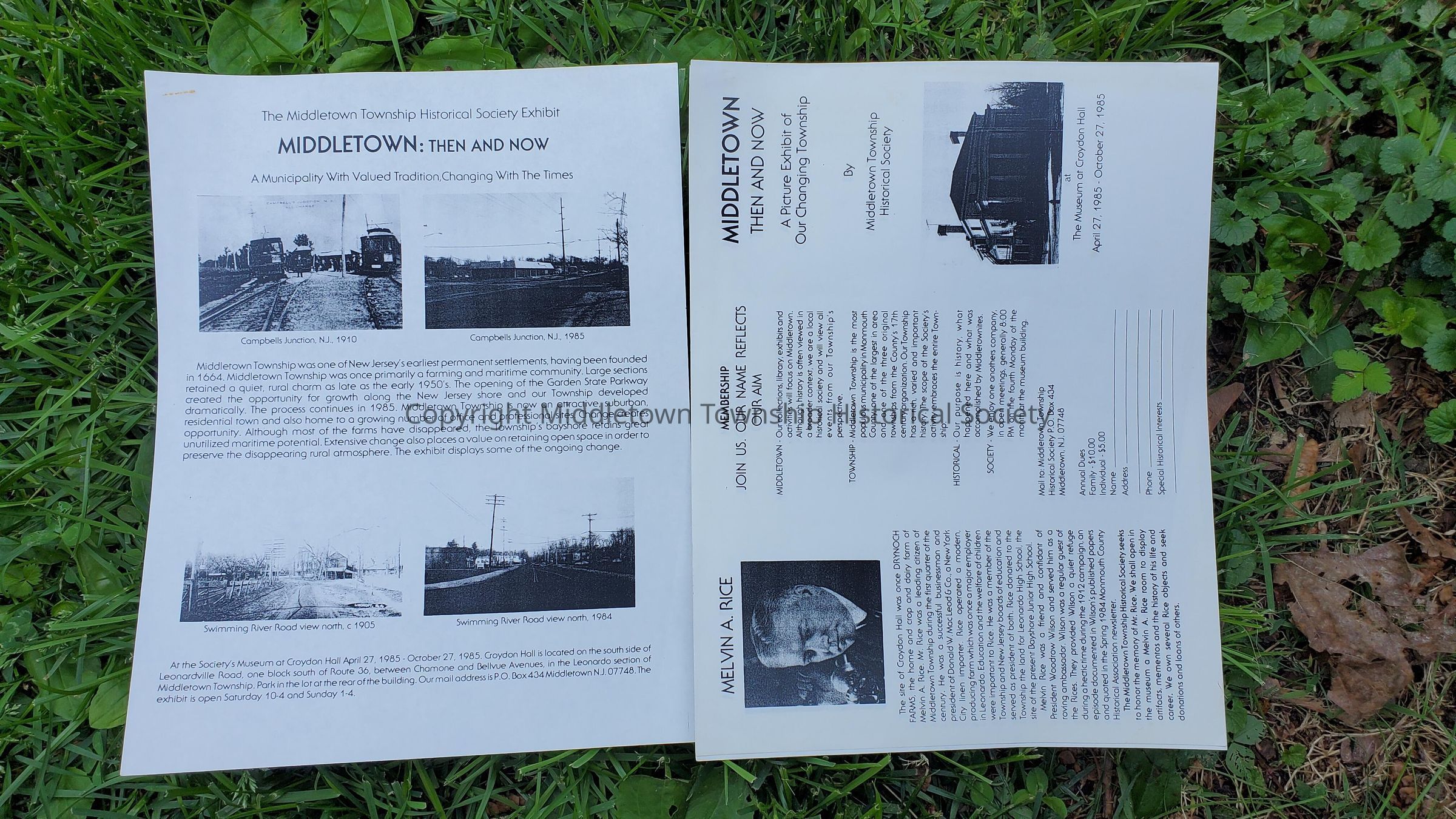 Materials available at the first exhibit (Middletown: Then and Now) of the Middletown Township Historical Society held at their new museum located in Croydon Hall (MacLeod Rice Mansion) in 1985.