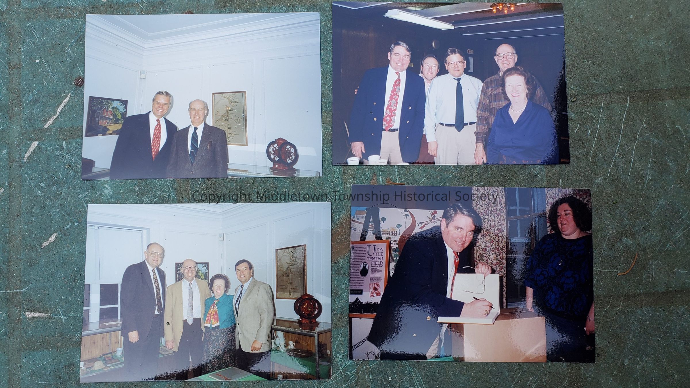 Five photographs from various exhibit openings from 1988 to 1995 at the MacLeod Rice/Croydon Hall museum of the Middletown Township Historical Society. Featured are Society members Randall Gabrielan and Peg Jordan, and Township Committee members Patrick Parkinson and Paul Linder.Acquisition