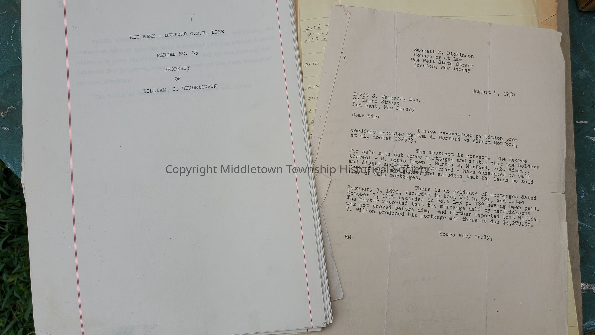 Documents relating to the Orchard Manor development on Tindall Road. Various correspondence and deed chain. Mentions of Morford and Hendrickson families.Acquisition