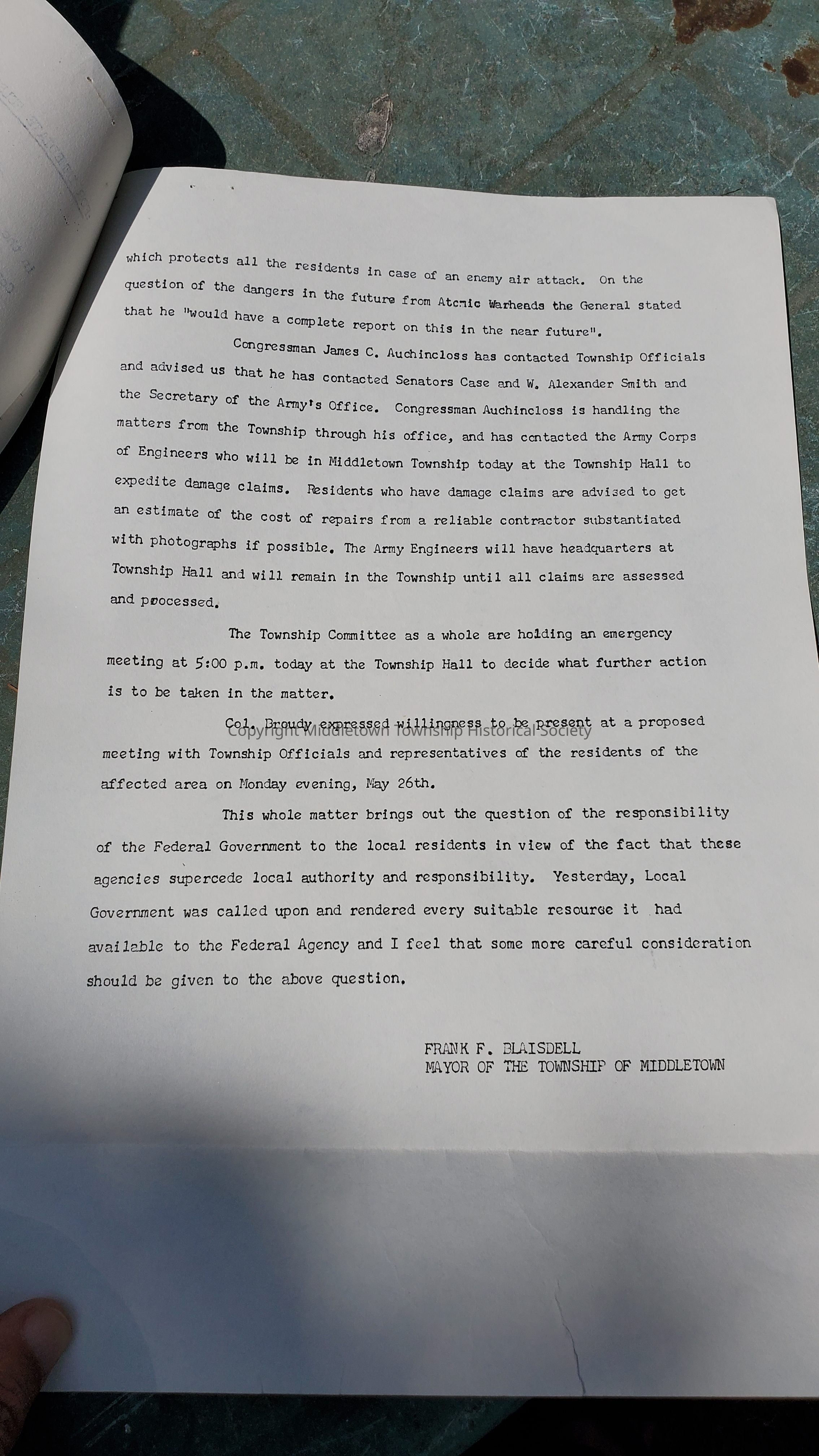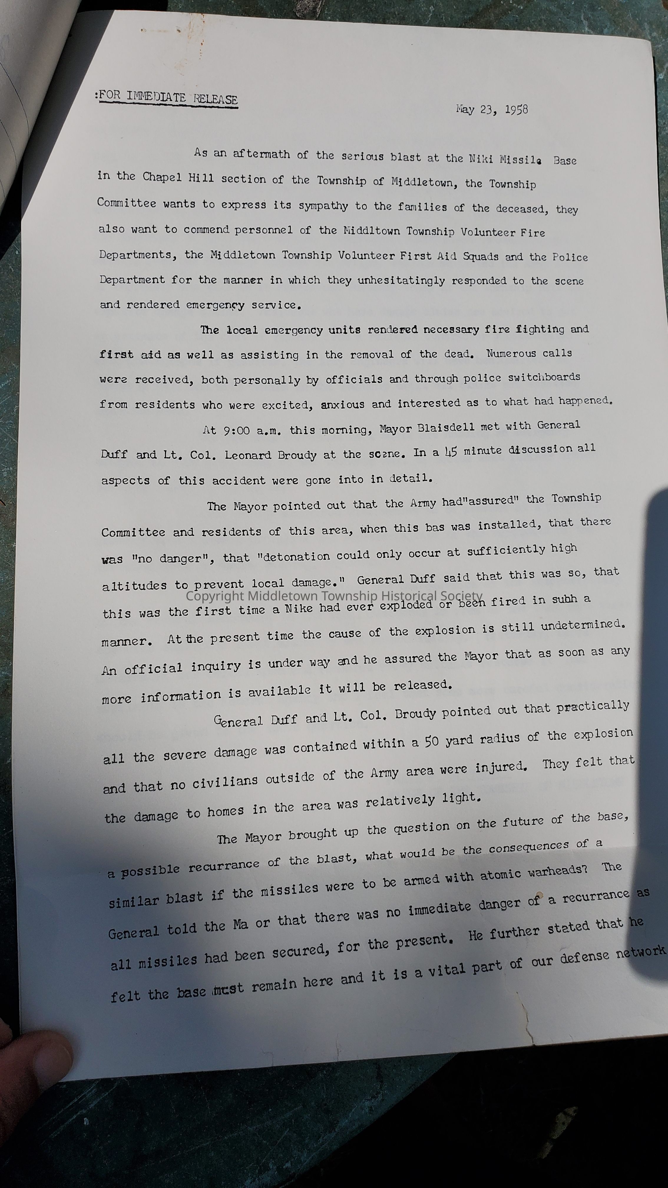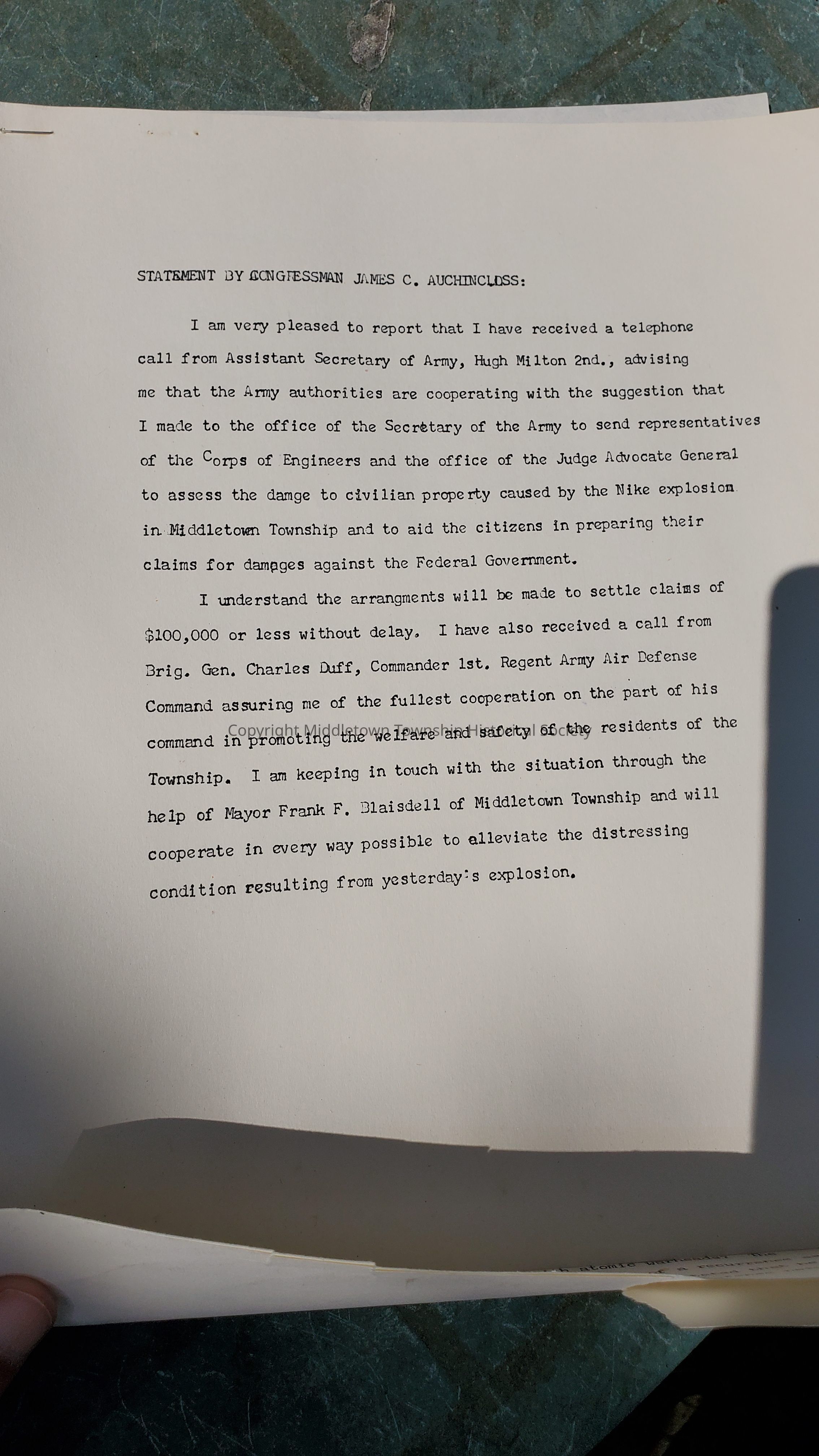 Press releases concerning the 1958 Nike Missile accident in Chapel Hill. Included is one from Congressman James C. Auchincloss and Middletown Mayor Frank Blaisdell.