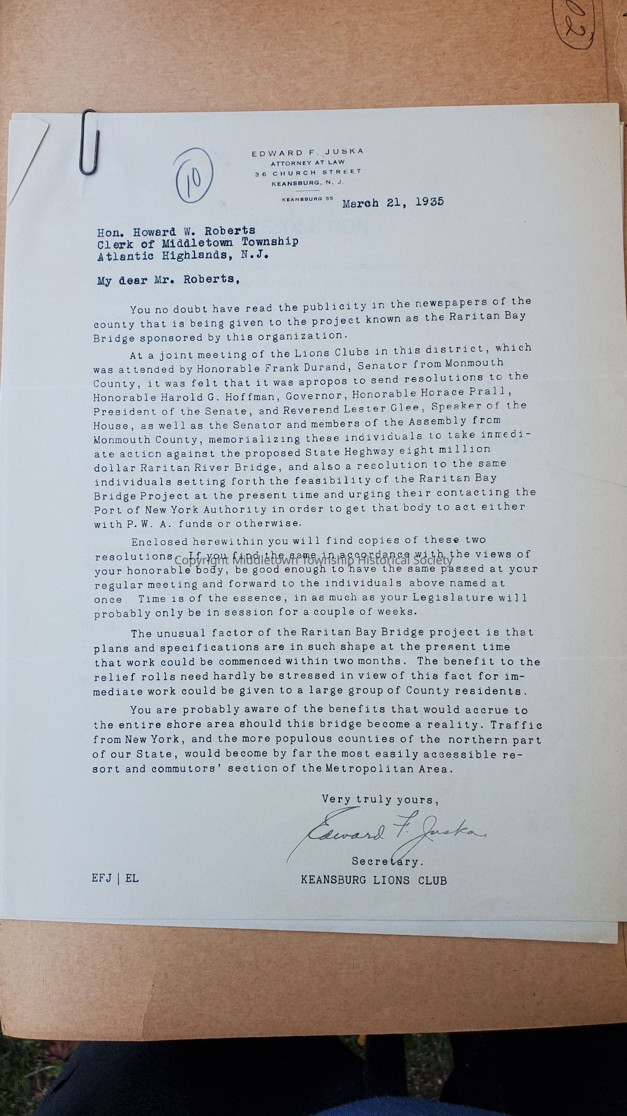 Correspondence from 1935 from Keansburg Lions Club seeking the support of Middletown Township against a proposed second bridge across the Raritan River (what is now Route 9/Garden State Parkway, in addition of the Route 35 Victory Bridge), in favor of another bridge stretching from Staten Island to Keansburg or thereabouts.Acquisition