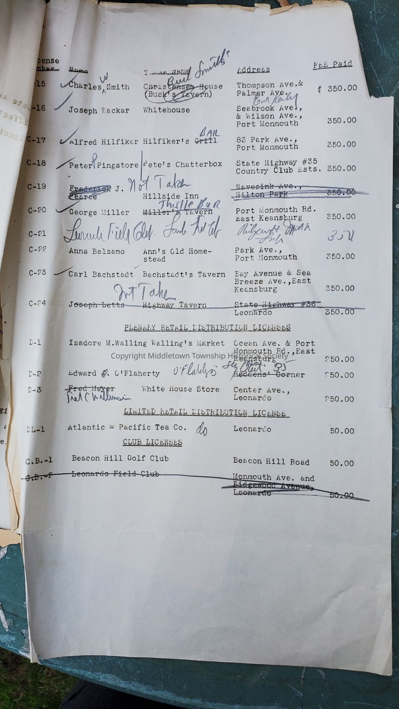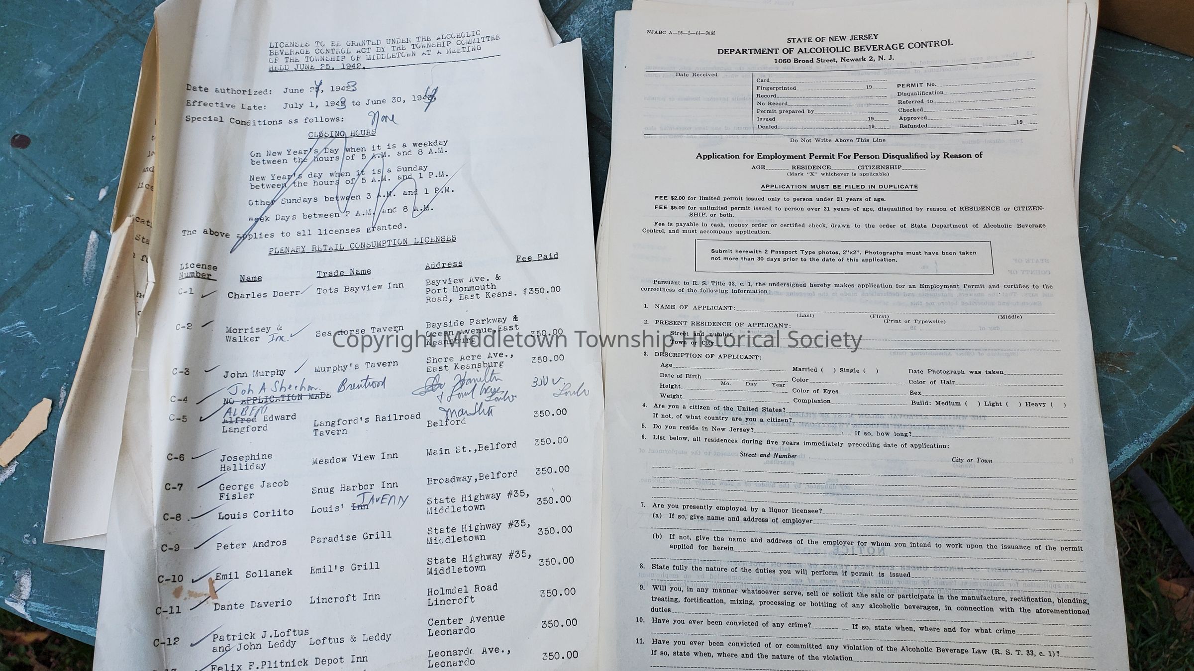List of township establishments granted retail consumption (alcohol/liquor) licenses for July, 1943 to June, 1944. Popular establishments include Meadowview Inn, Lincroft Inn, Whitehouse (Seabrook-Wilson House), Bucky Smith's, Bachstadt's, Beacon Hill Golf Club, and more. Also includes blank state applications.Acquisition