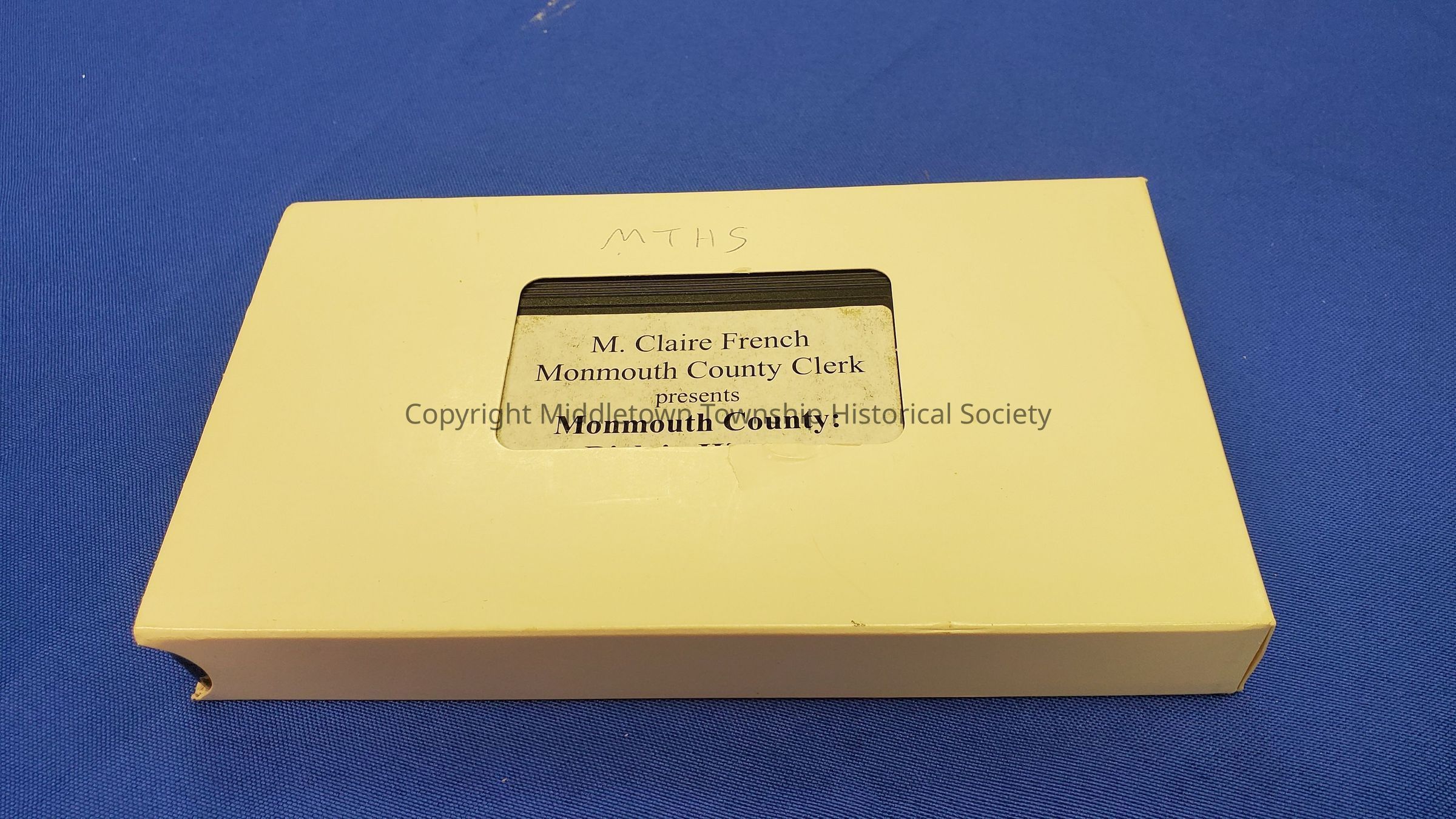 VHS tape from the early 1990s. A travelogue of Monmouth County historical sites hosted by Monmouth County Clerk M. Claire French and historian Randall Gabrielan.Publication Details