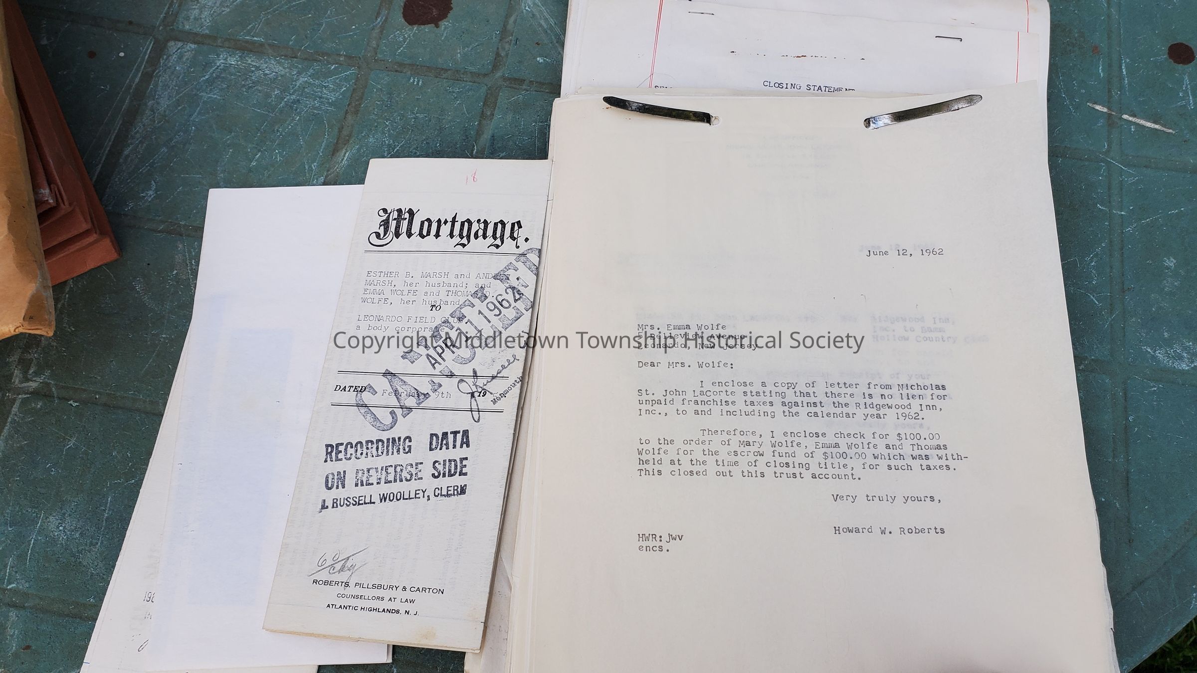 Documents concerning sales of the Ridgewood Inn (located on corner of Ridgewood Ave and Monmouth Ave in Leonardo) by Esther and Andrew Marsh and Thomas and Emma Wolfe to or from the Leonardo Field Club; also sale to Bamm Hollow Country Club, so that the liquor license could be acquired for the new club. 1961 to 1962.Acquisition