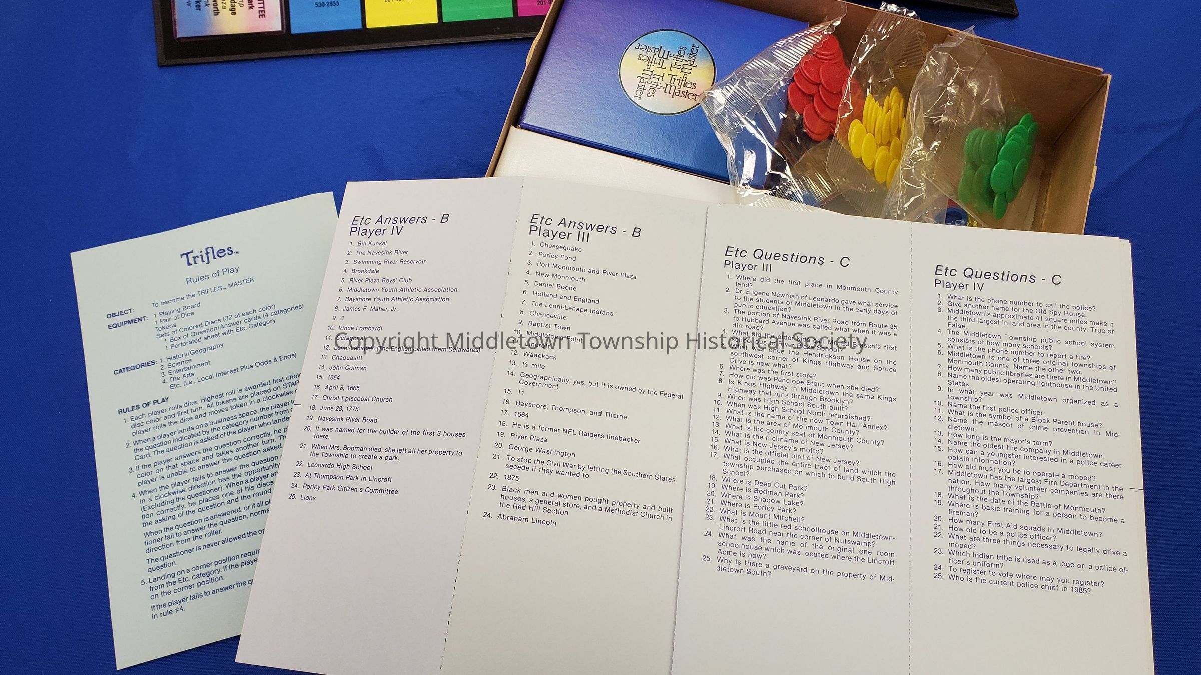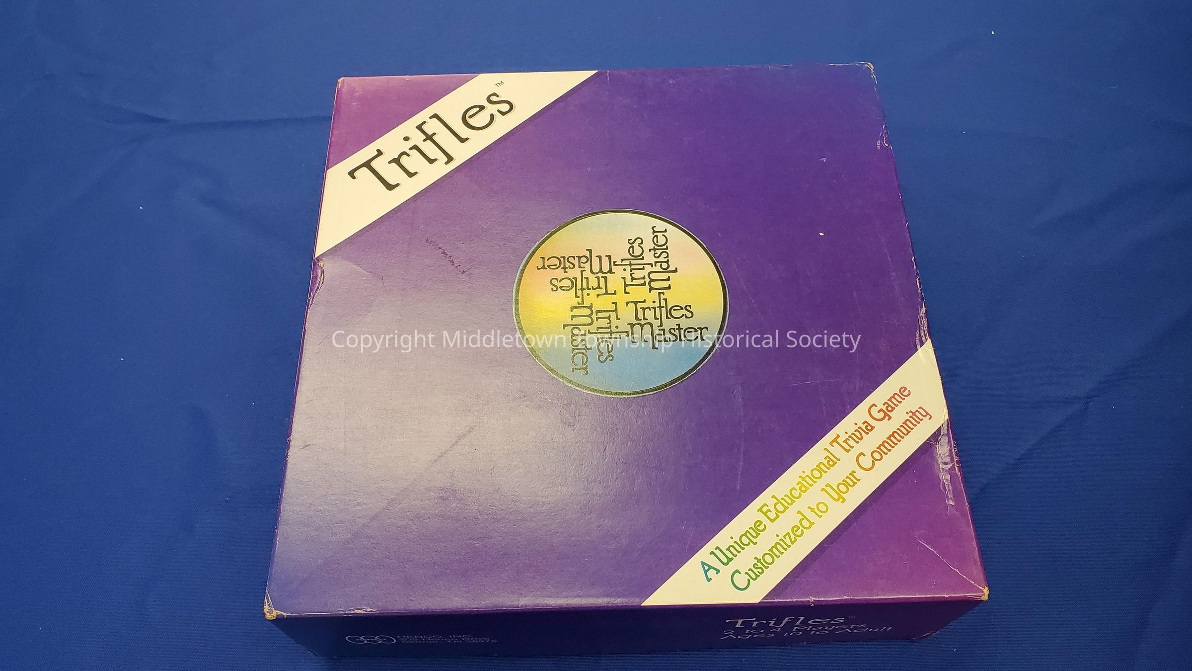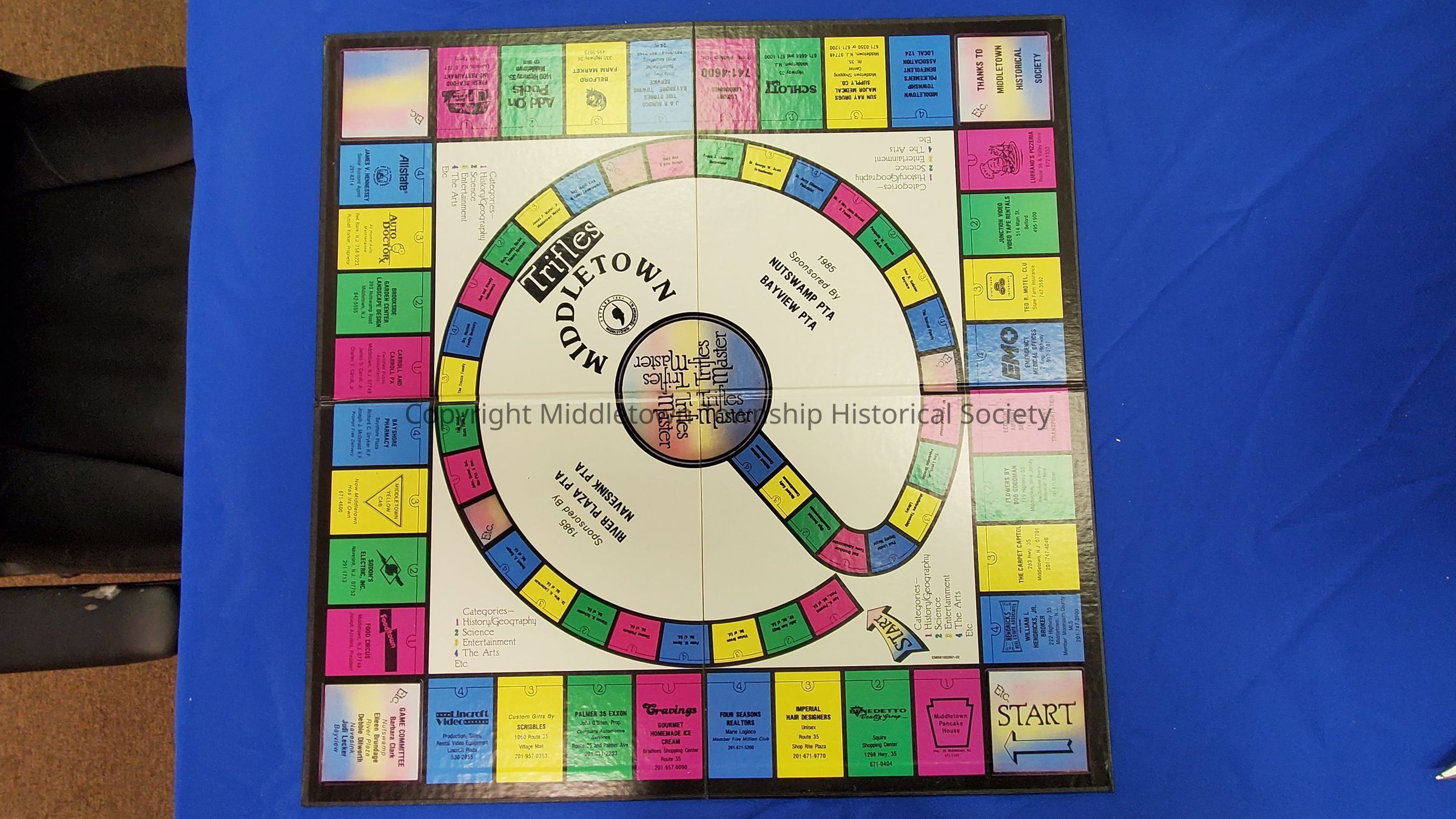 Board game from 1985 by the Trifles company. Contains generic trivia questions and also ones about Middletown (some of which were supplied/fact checked by Middletown Township Historical Society). The board includes ads of local businesses. The game was a fundraiser for the PTAs of 4 elementary schools. Partially unopened.Acquisition