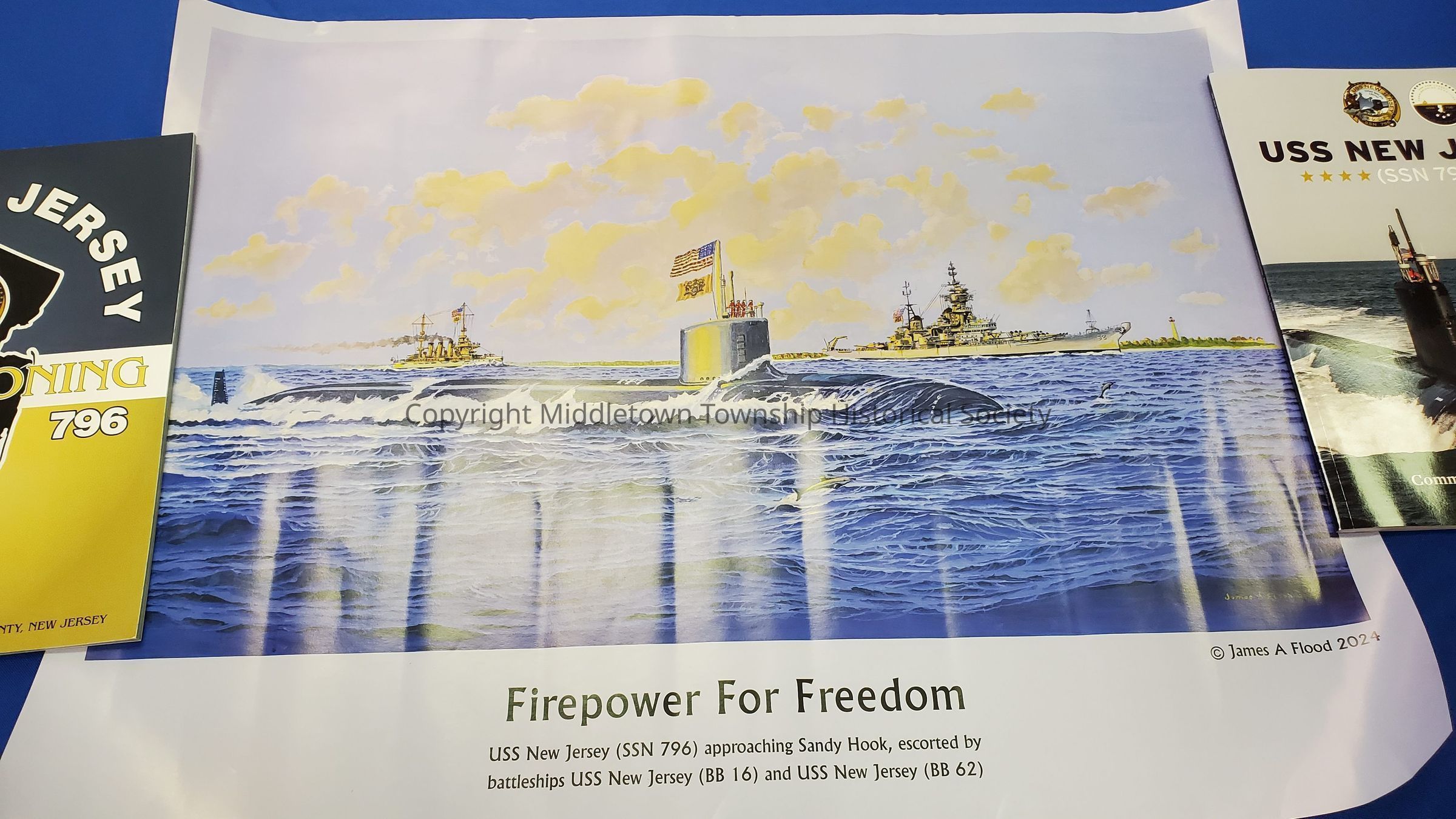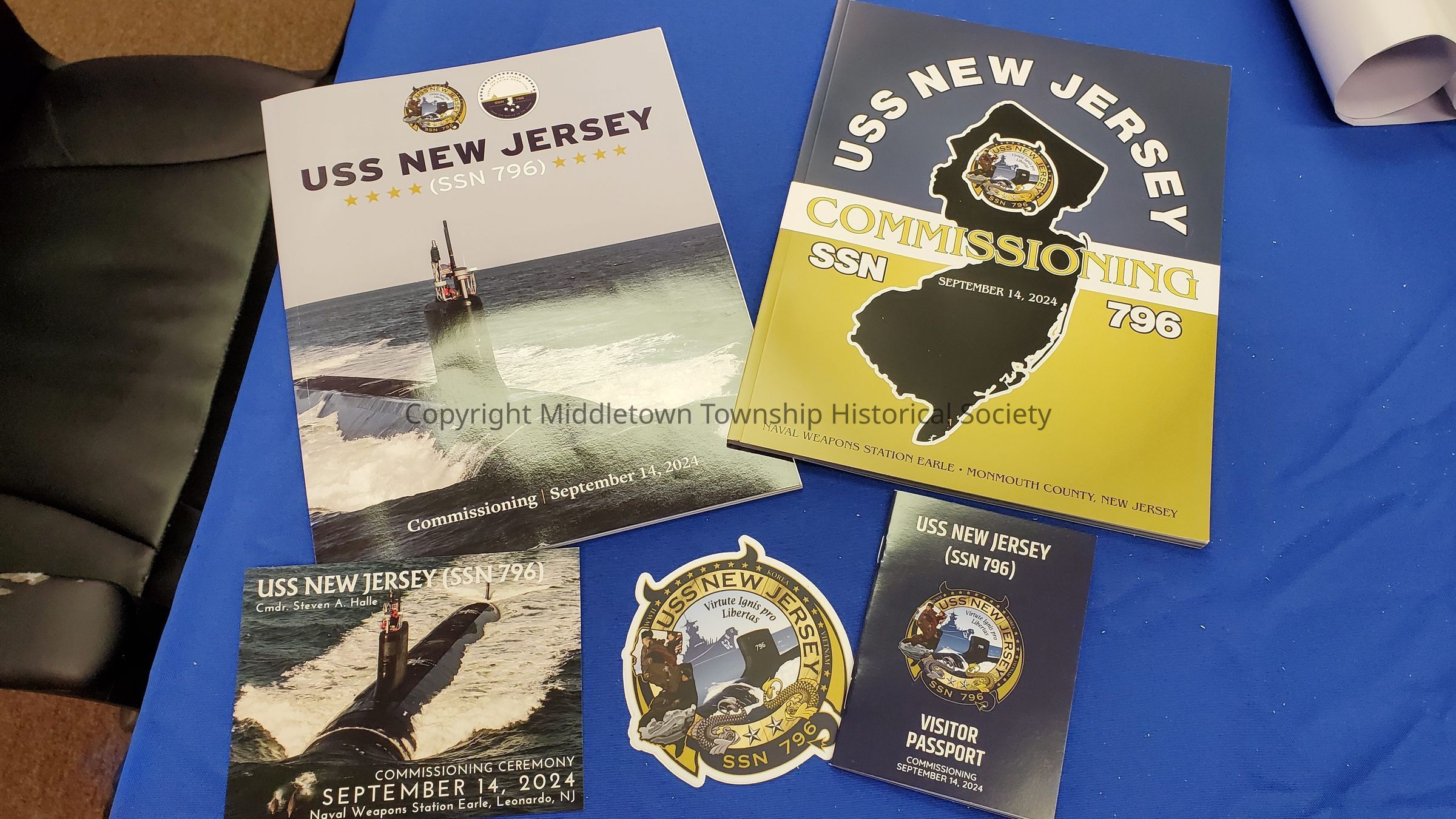 Collection of ephemera from the commissioning ceremony of USS New Jersey held at NWS Earle in Leonardo on September 14, 2024. Included: two different advertising programs, a passport guide, sticker, ship layout, and poster.Acquisition