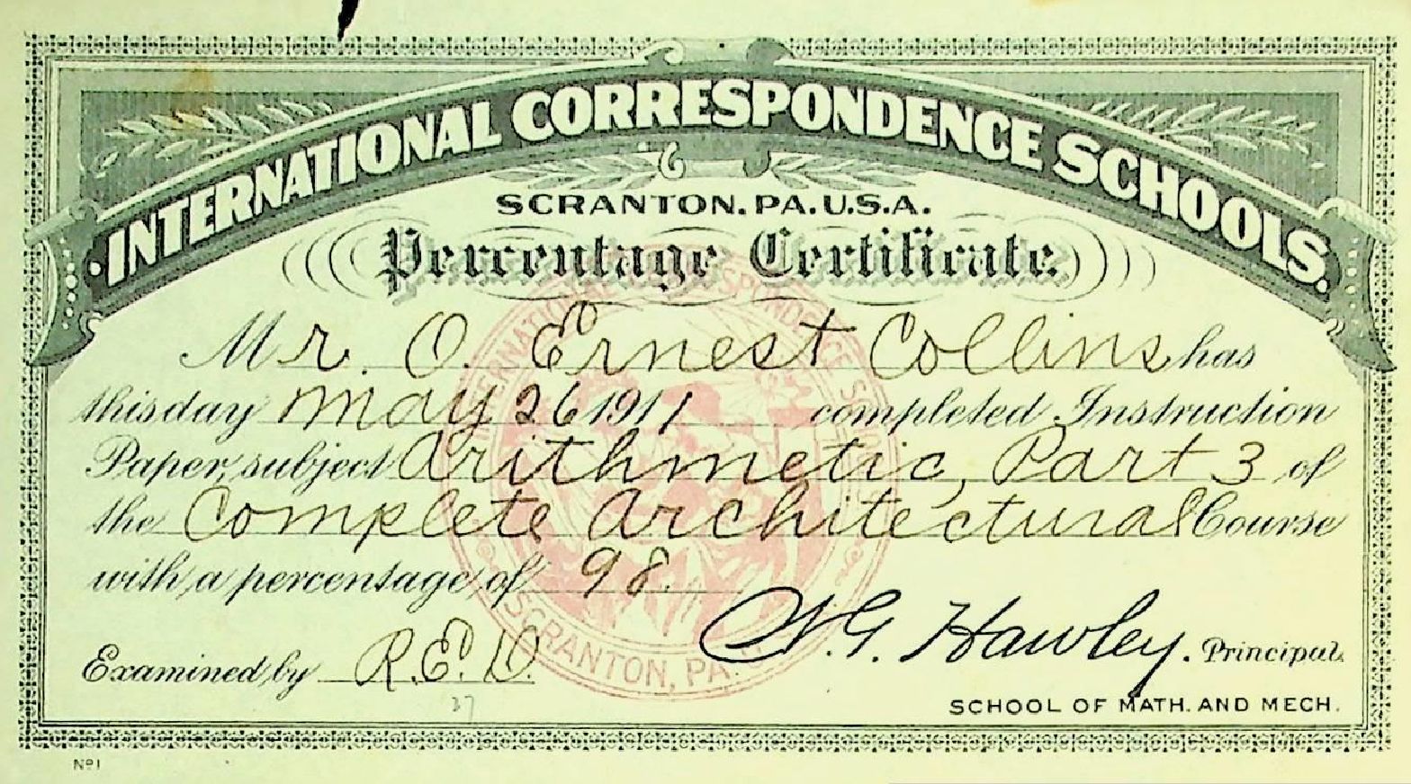 International Correspondence Schools Certificate - Arithmetic Part 3 of the Complete Architecture Course - issued to O. Ernest Collins May 26, 1911Condition