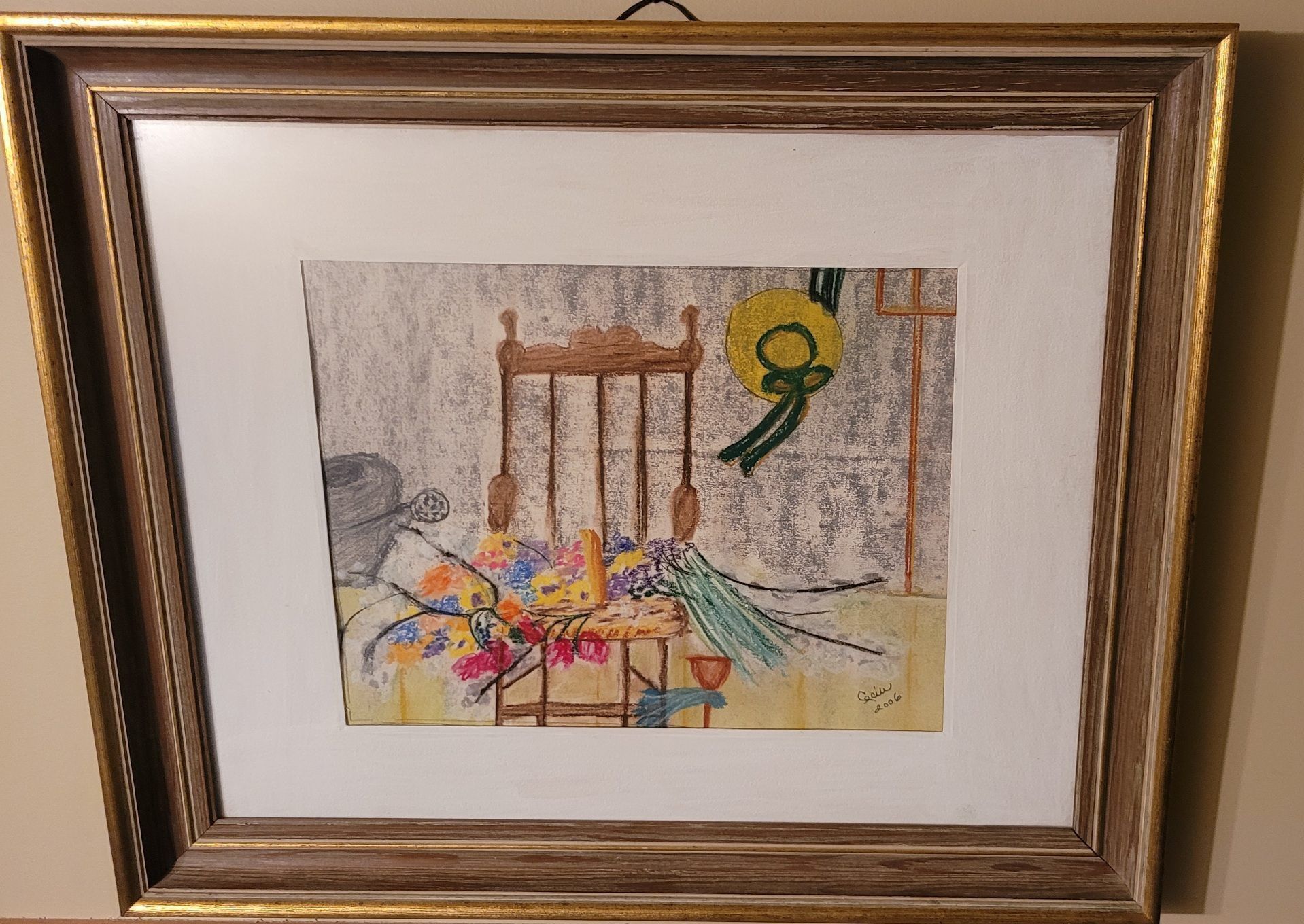 Framed and matted drawing of chair, with flowers, watering can, hatContext