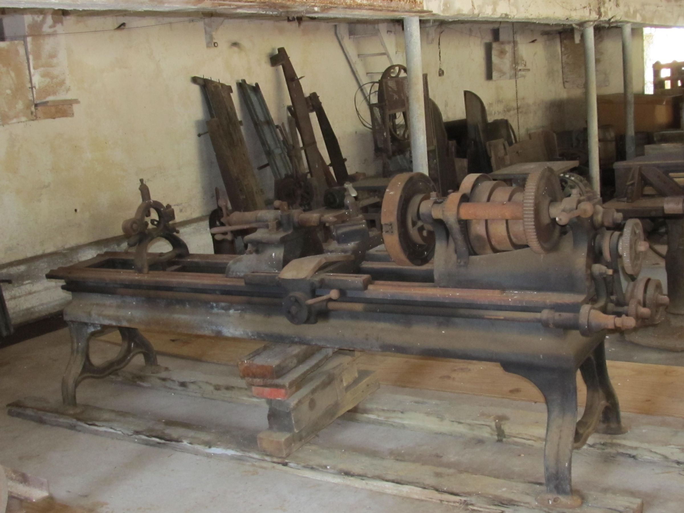 This large metal lathe has a 10-foot bed, and a 22-inch swing. It was purchased, used, from the Charles Bonn Paper Machine Co, Philadelphia, PA for $30. All the tooling for this lathe is in Carton 9.