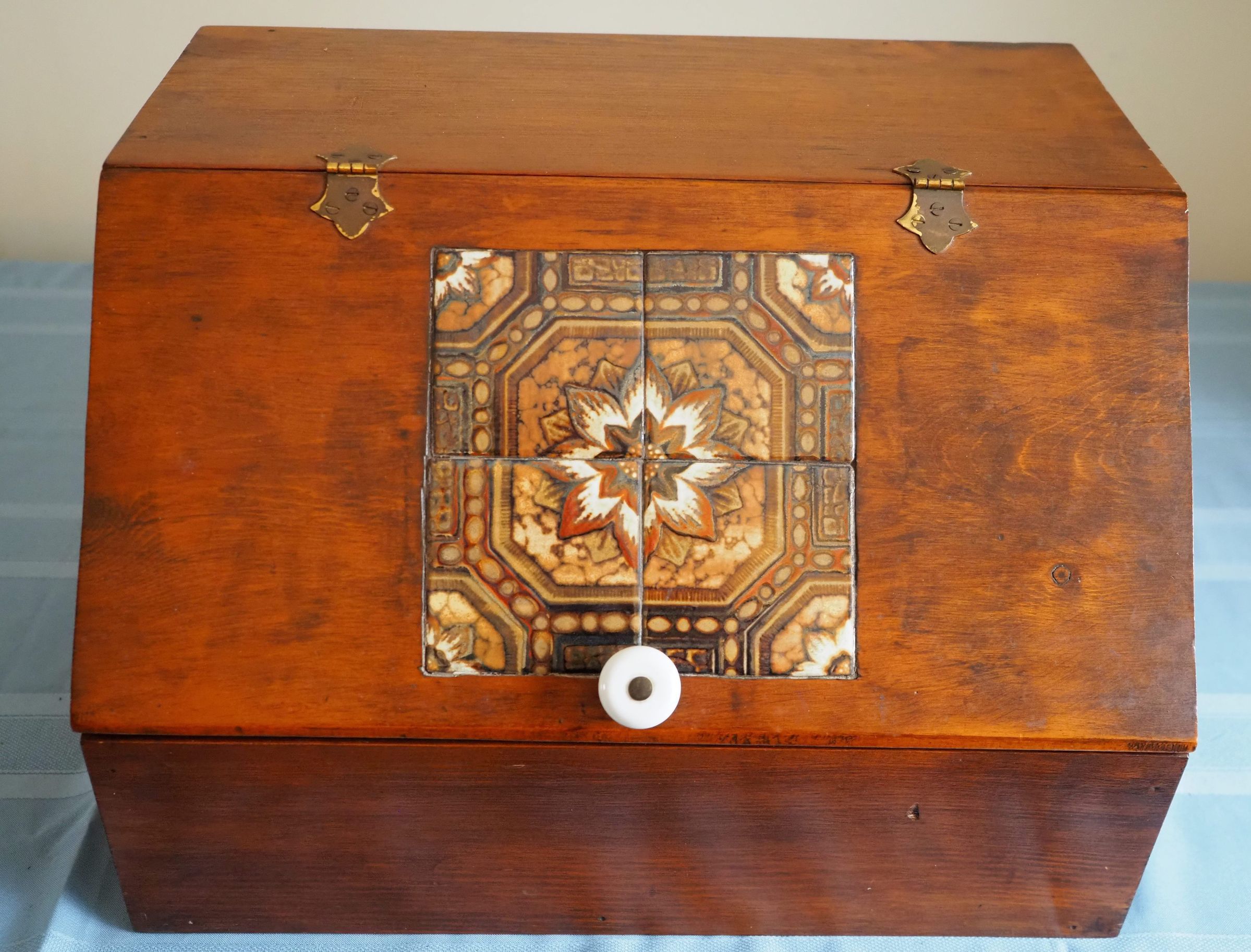 Wood bread box with ceramic tile inserts, knob, and hinged topAcquisition