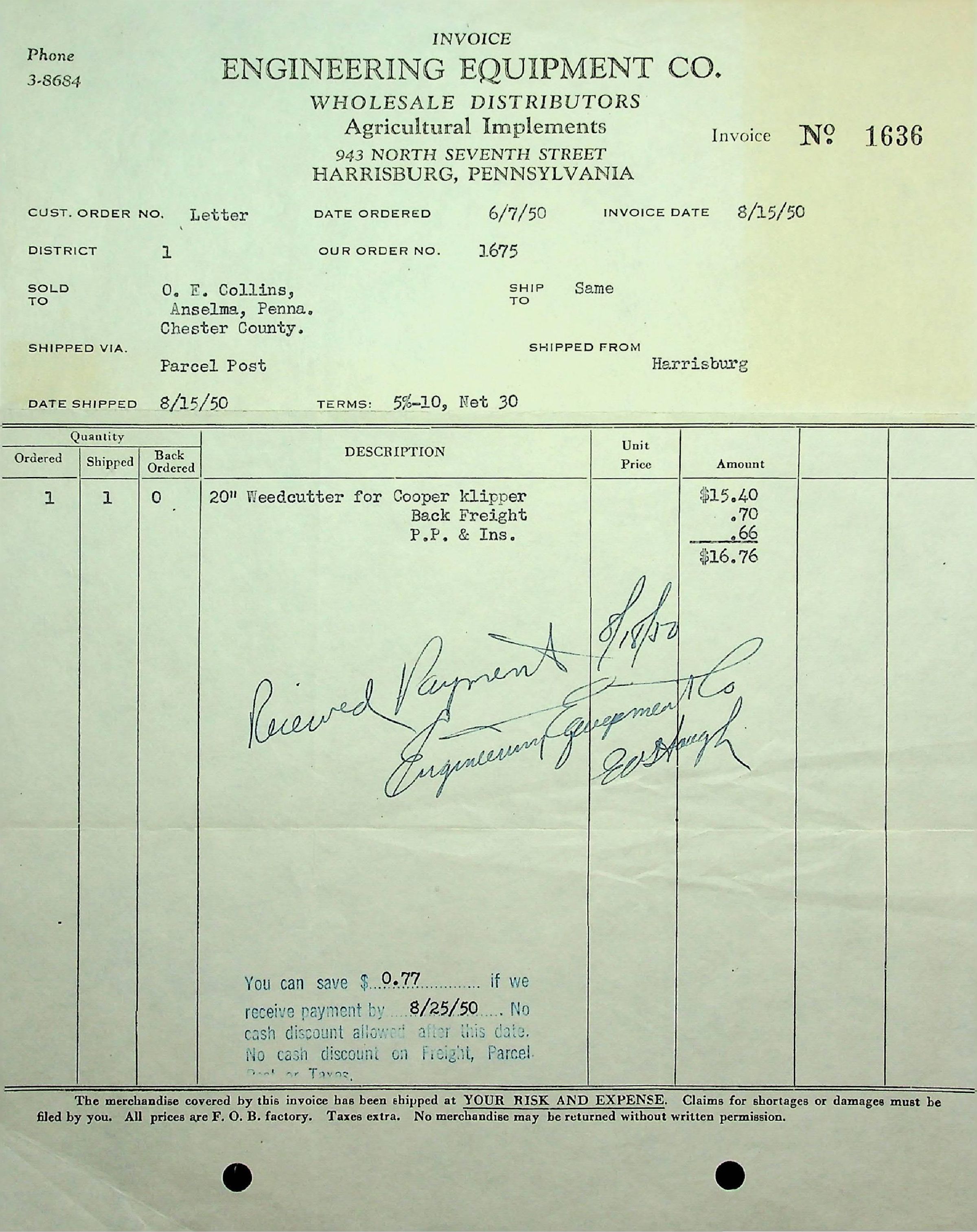Dated 8/15/50 found in Collins Day Book 1927-1943 between pages 176 & 177