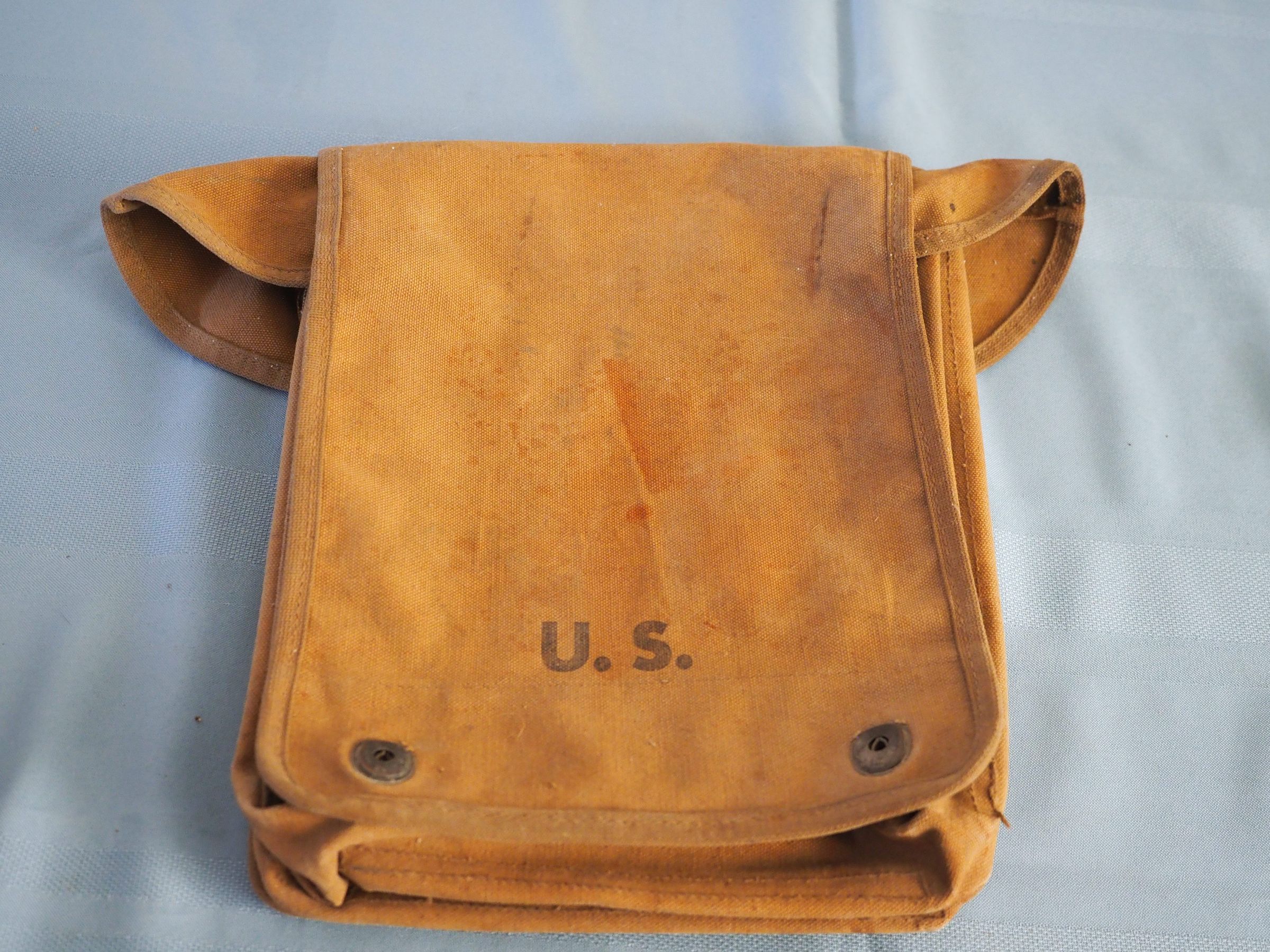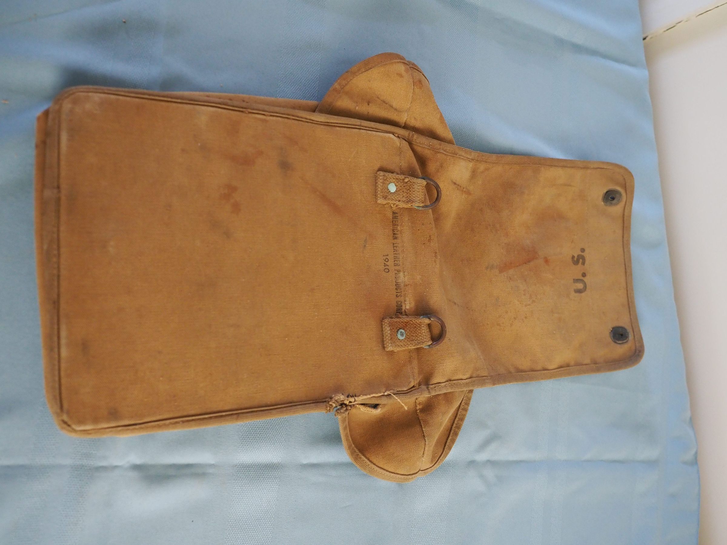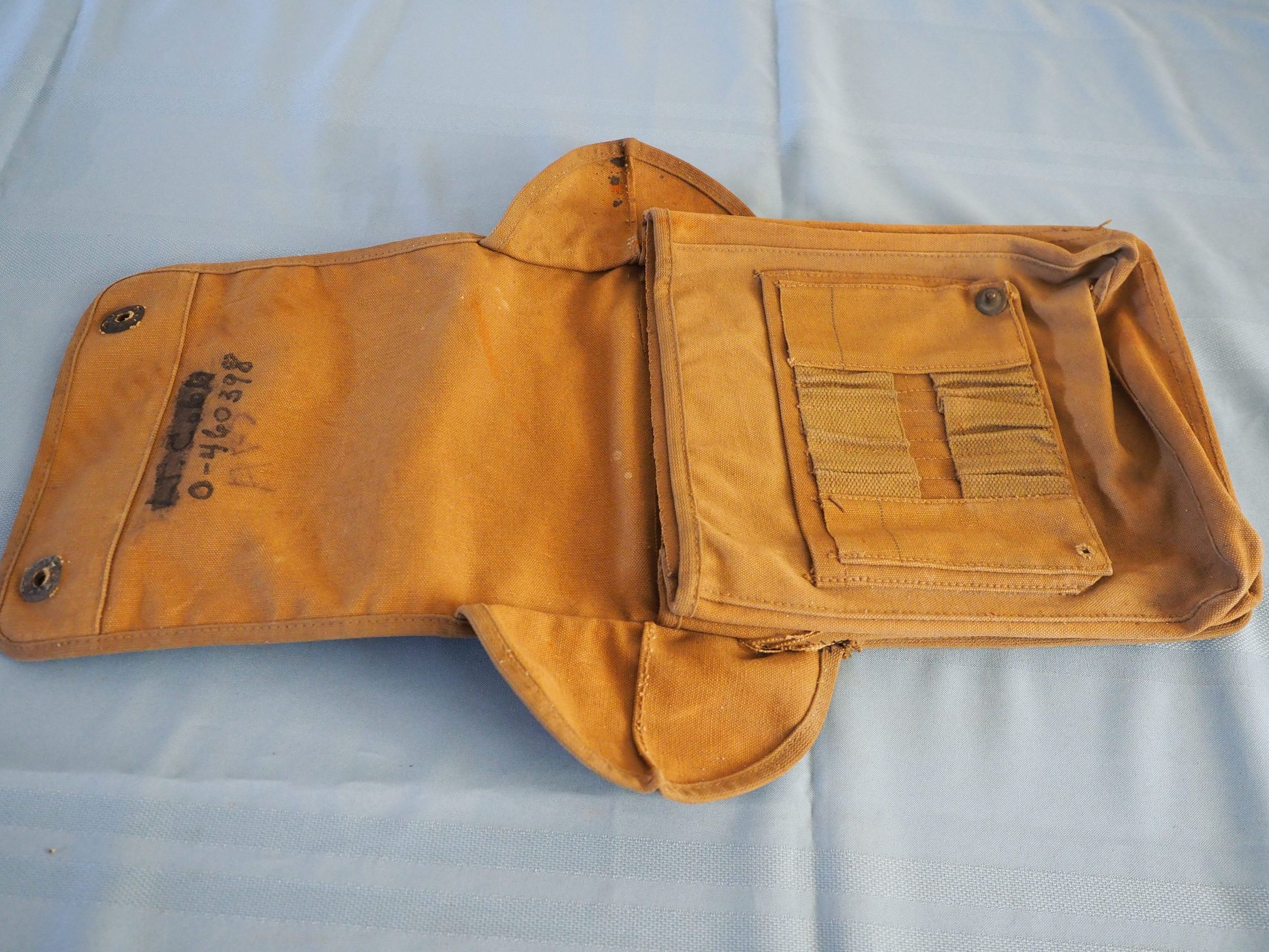 Canvas bag with 3 dividers inside and many pockets; 2-snap front flap, hooks on back, stiff backing, cloth binding on edgesMade/Created