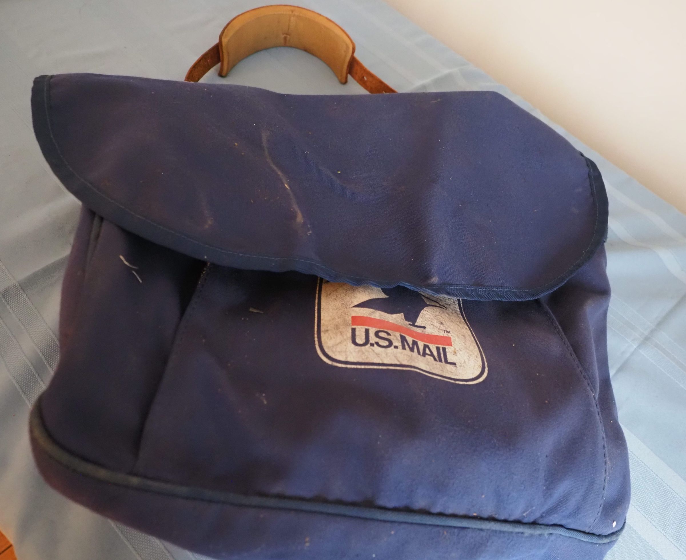 Mail bag, cloth, blue, carrier satchel with leather strapMade/Created