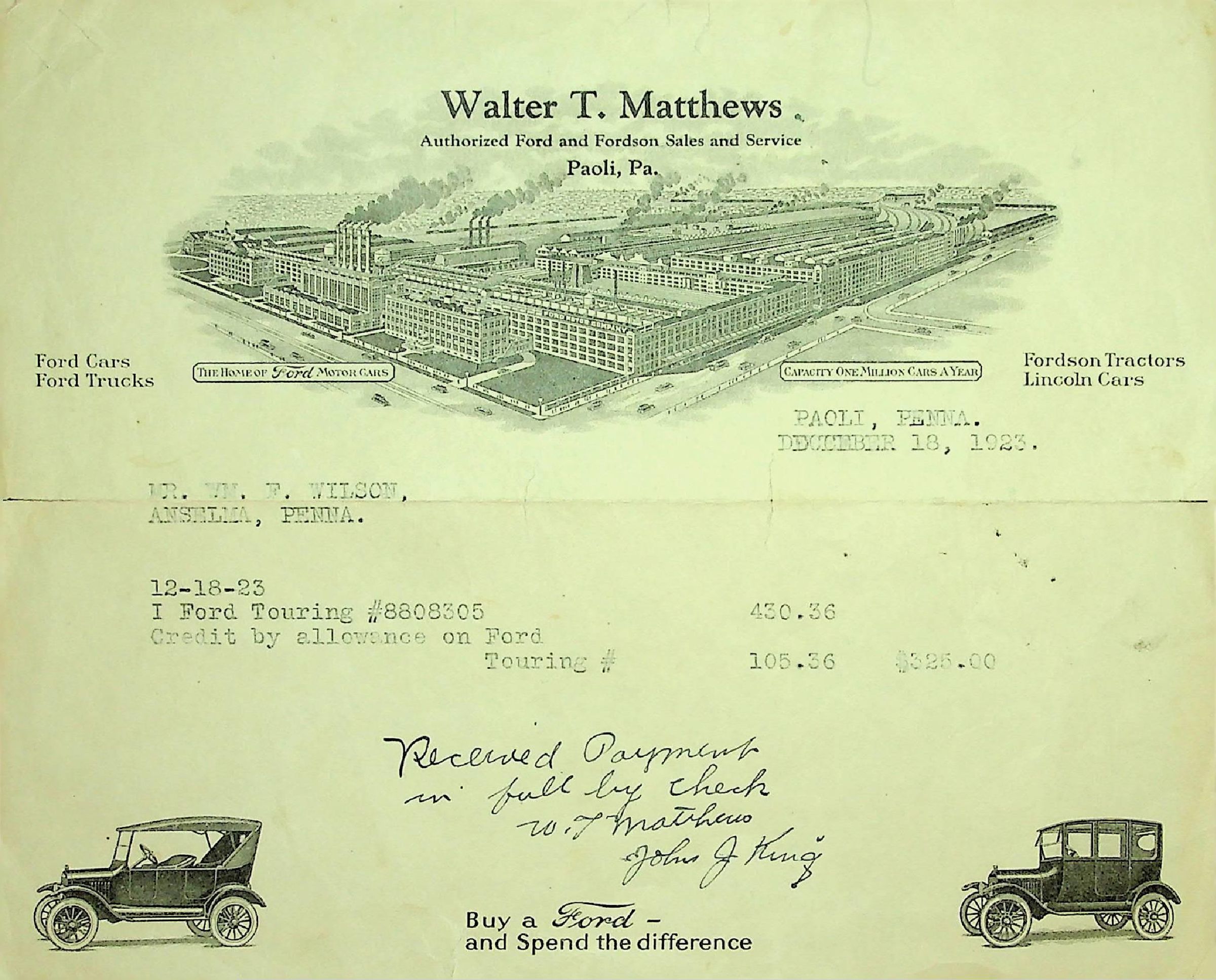 Purchase of Ford Touring car by Mr. Wm. F. Wilson of Anselma, Pa, dated November 18, 1923Collection