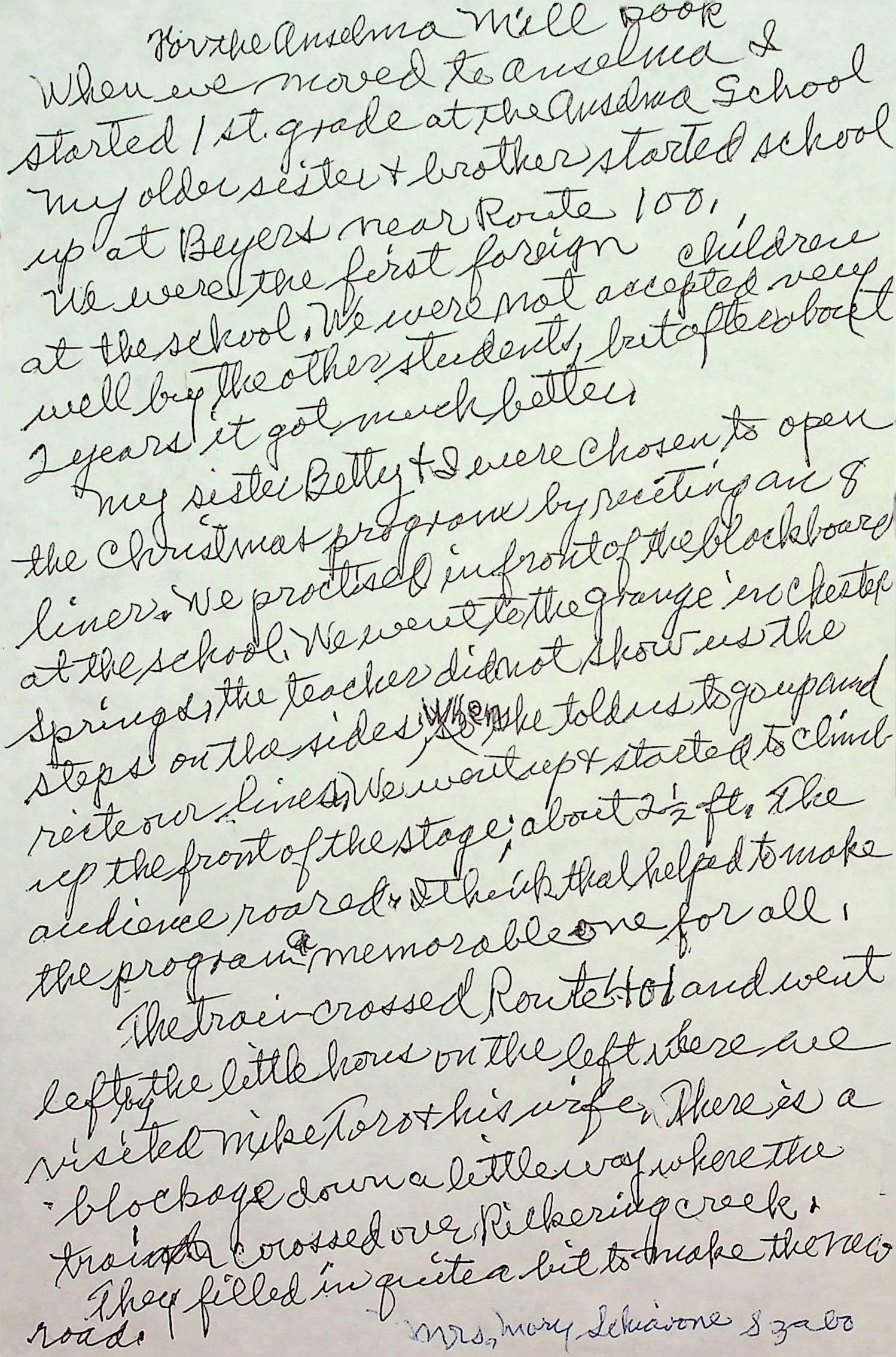 Copy of a hand written biography by Mary Szabo. Pages one and two.
