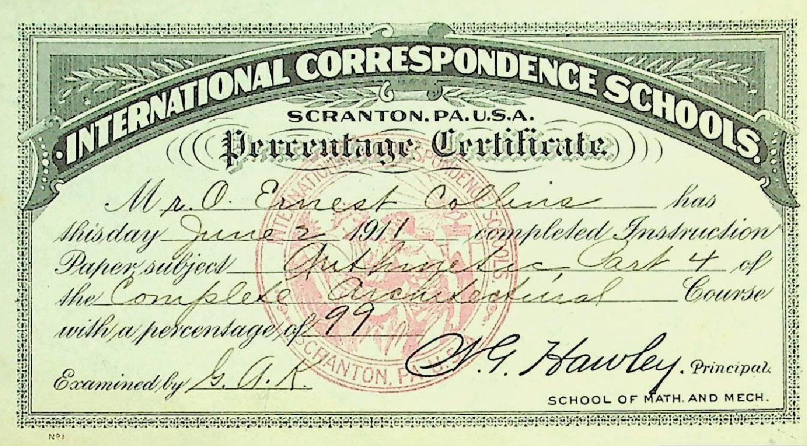 International Correspondence Schools Certificate - Arithmetic Part 4 of the Complete Architecture Course - issued to O. Ernest Collins June 2, 1911Condition
