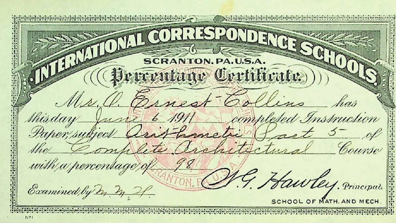 International Correspondence Schools Certificate - Arithmetic Part 5 of the Complete Architecture Course - Issued to O. Ernest Collins June 6, 1911Condition