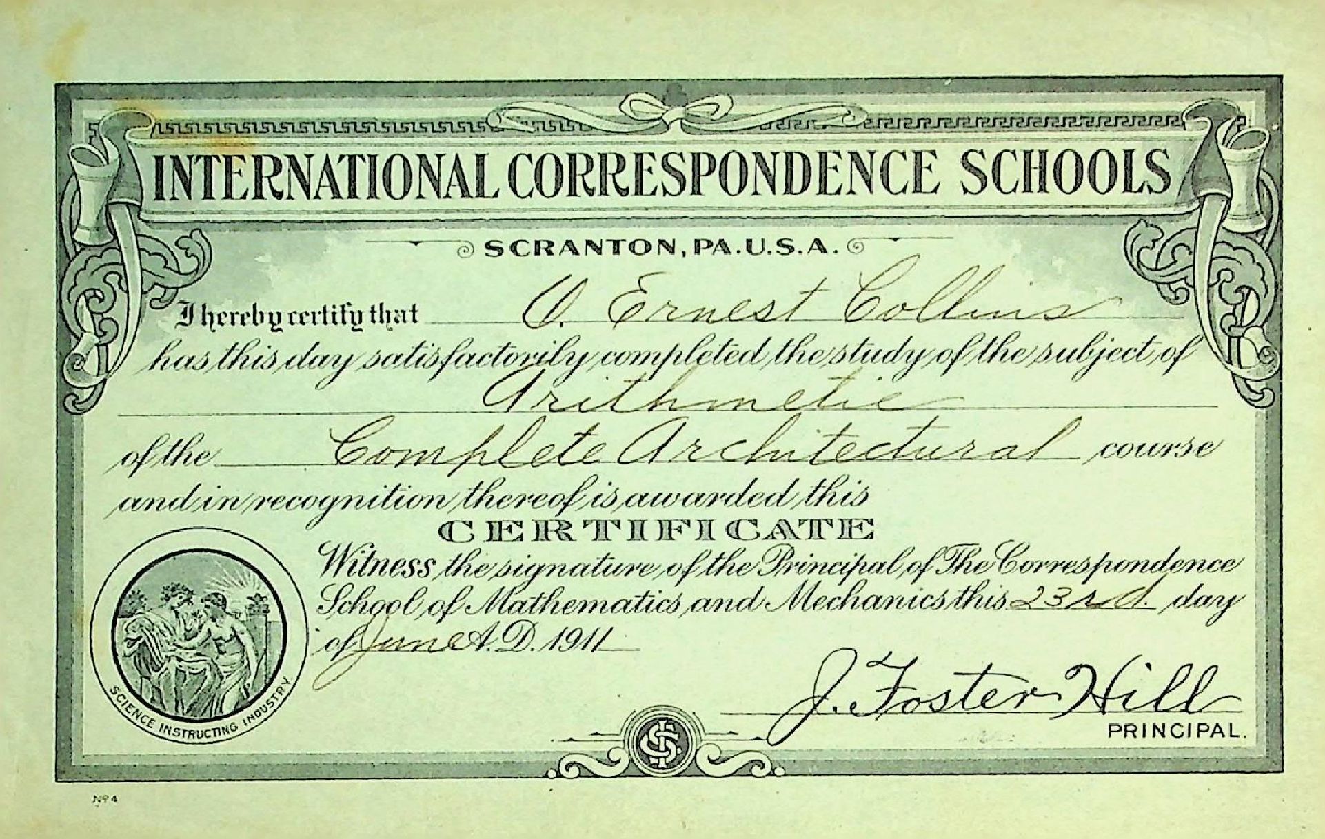 International Correspondence Schools Certificate - Arithmetic of the Complete Architecture course issued to O. Ernest Collins 23 June 1911Dimensions
