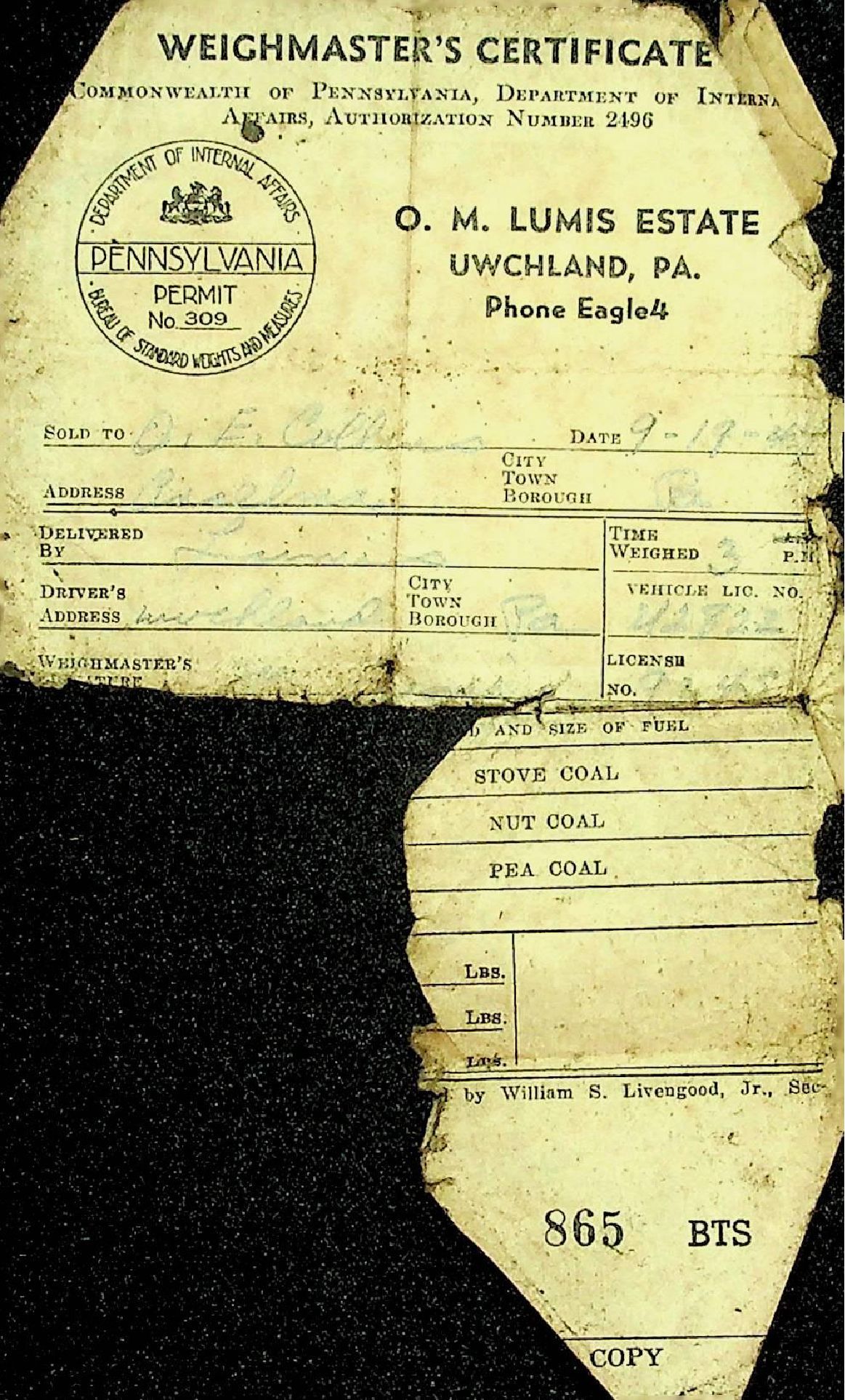 Sold to O.E. Collins, Dated 9/19/44