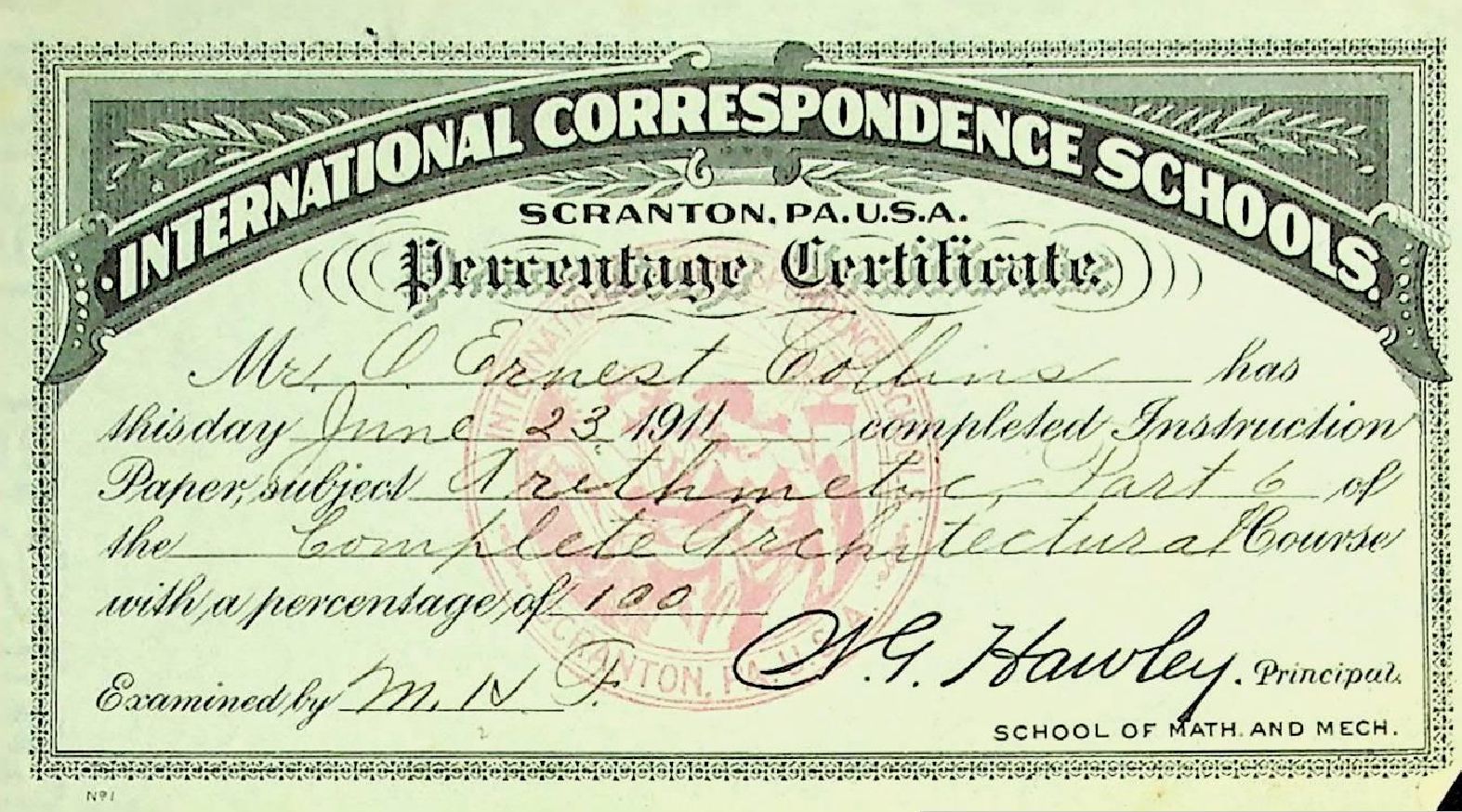 International Correspondence Schools Certificate - Arithmetic Part 6 of the Complete Architectural Course - issued to O. Ernest Collins June 23, 1911Condition