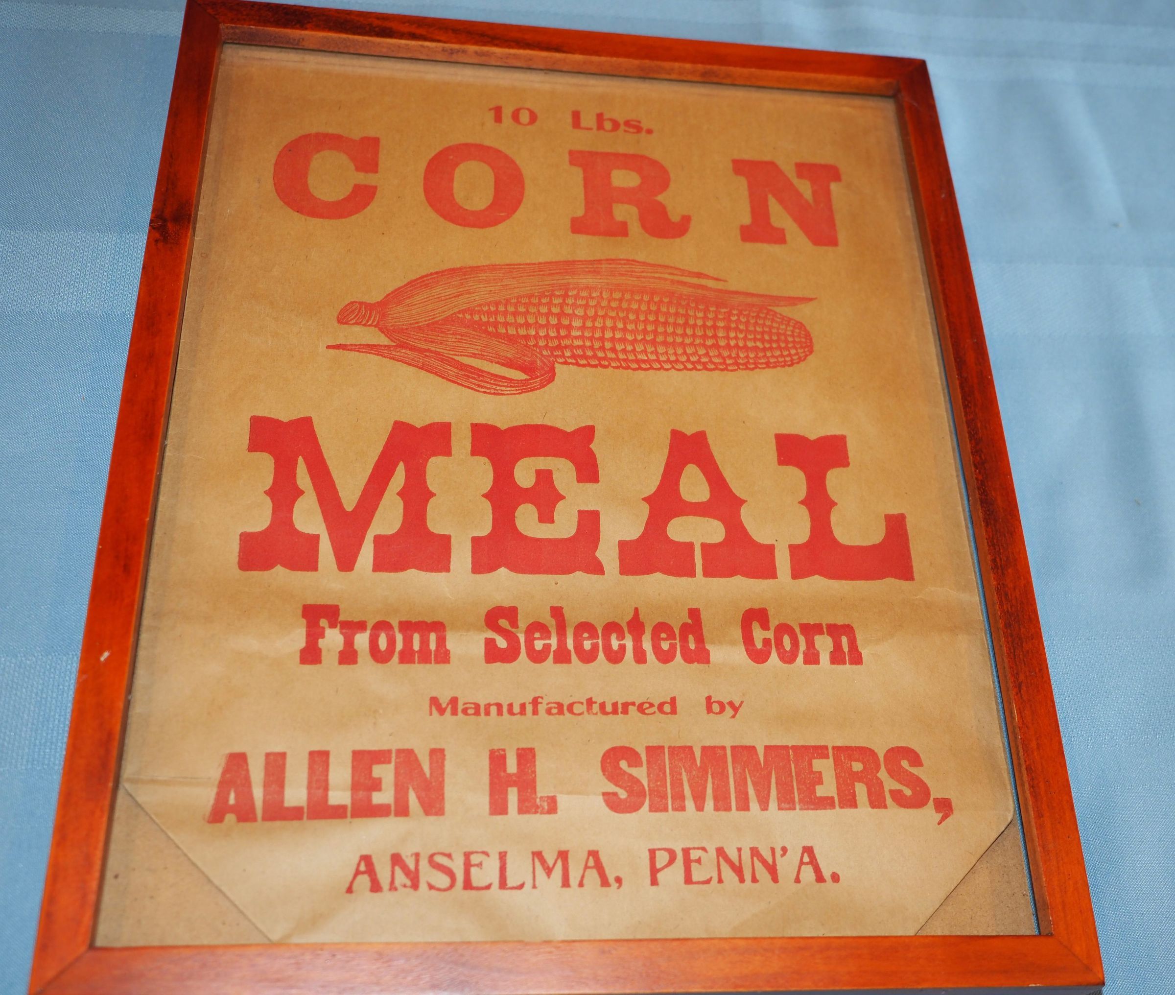 Framed corn meal bag; paper bag, "10 Lbs. CORN MEAL From Selected Corn"Made/Created