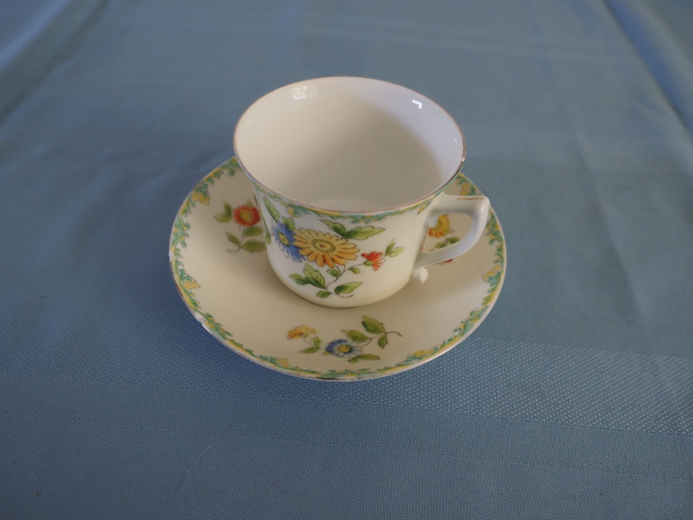 Cup and saucer with flower pattern; china-white with yellow and blue flowers and green leaves