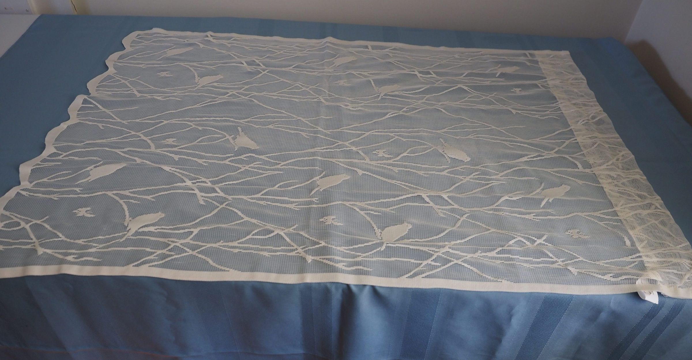 Curtain and valance; lace with birds and branches design, 2 panels, scalloped edge; valance is 1 scalloped edge panel; pocket curtain and valanceDimensions