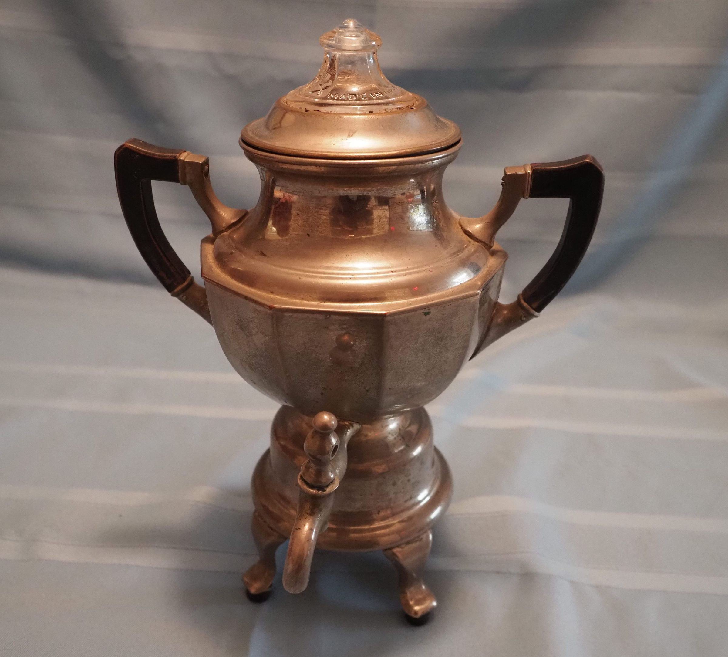Coffee pot with black wooden handles and glass top, spout, and four feet; electric (cord not included)Dimensions