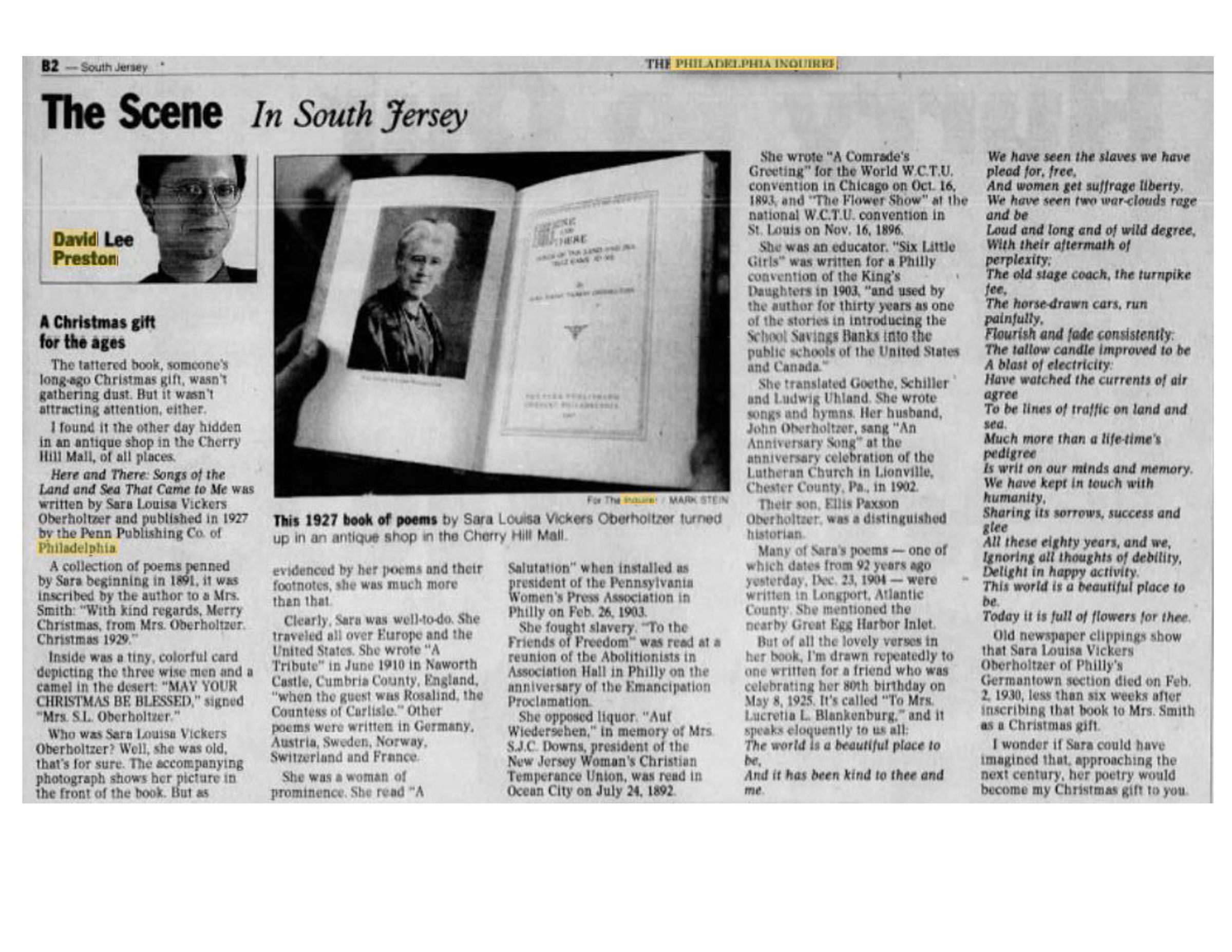 David Lee Preston Article: Sara Louisa Vickers Oberholtzer, Philadelphia Inquirer