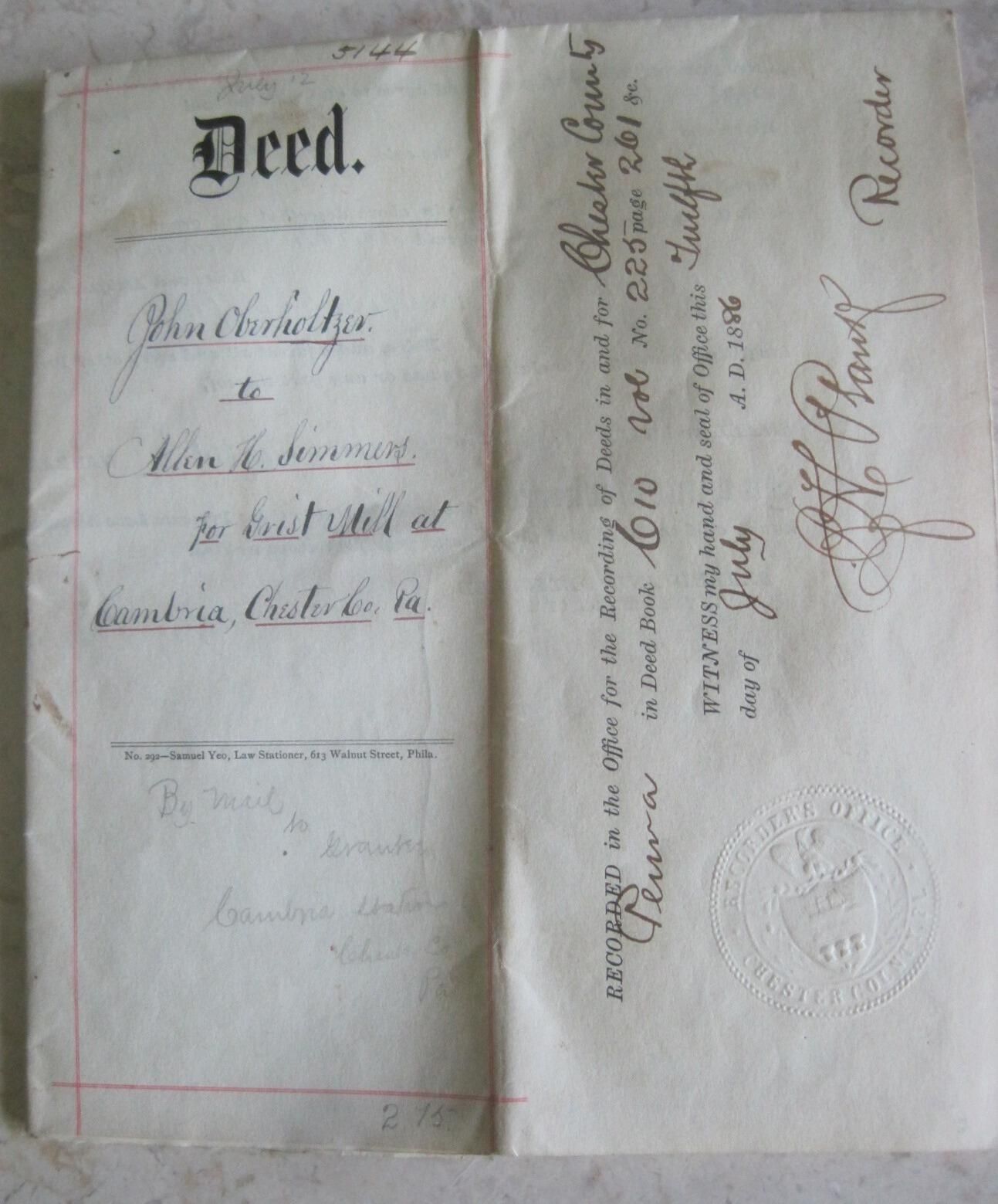 Deed transferring, Grist Mill at Cambria, Chester County, Pa., from