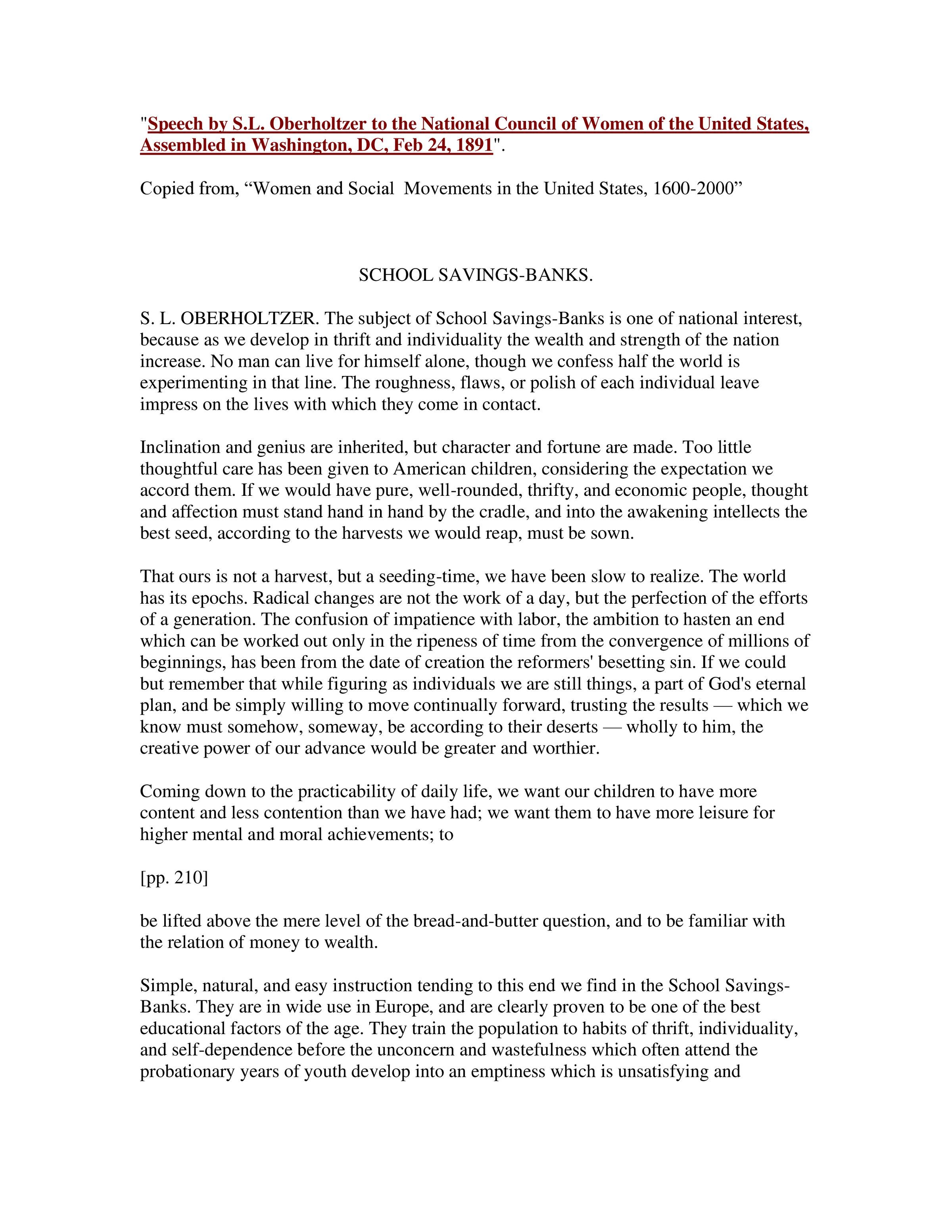 "Speech by S.L. Oberholtzer to the National Council of Women of the United States, Assembled in Washington, DC, Feb 24, 1891".