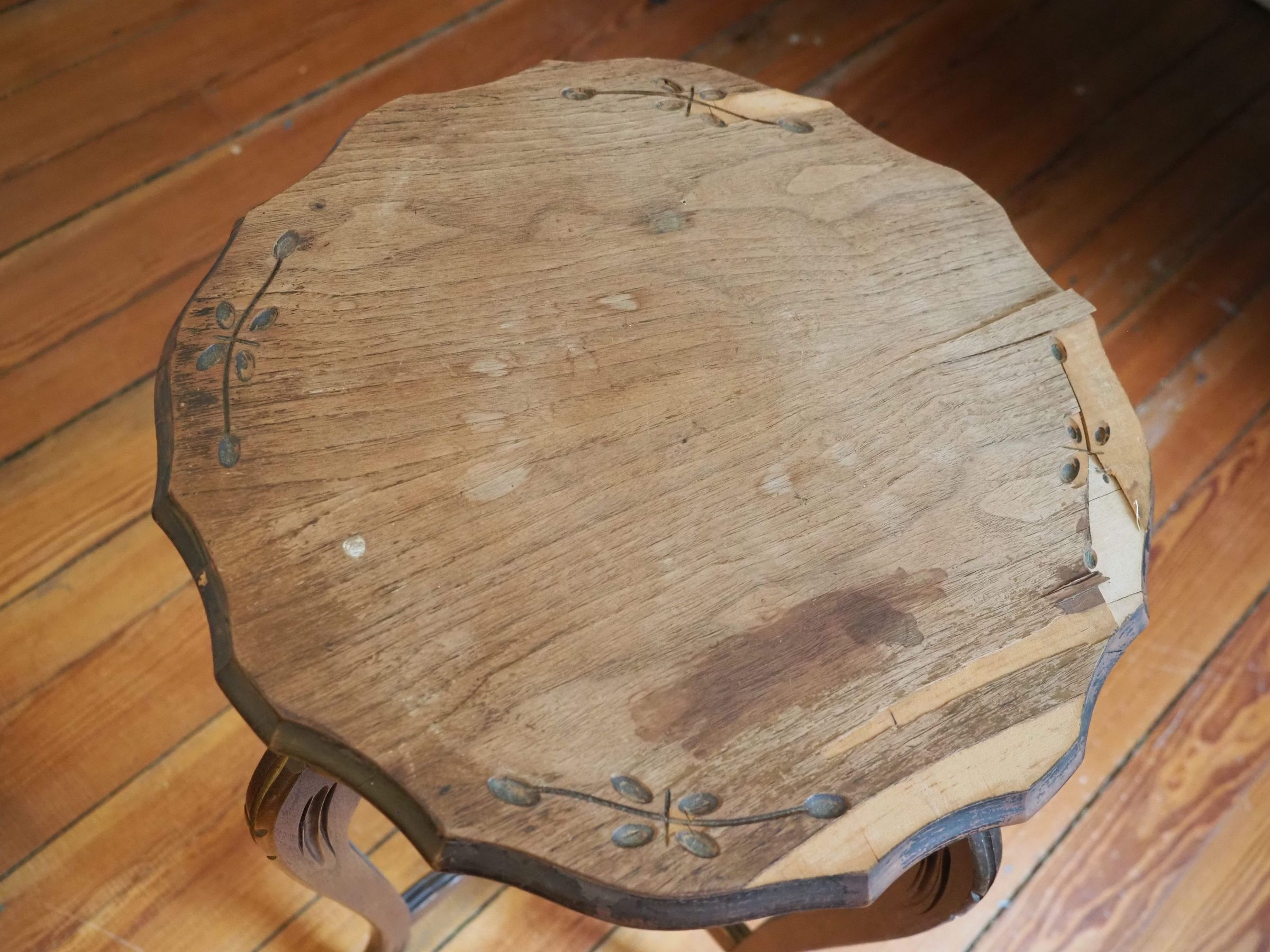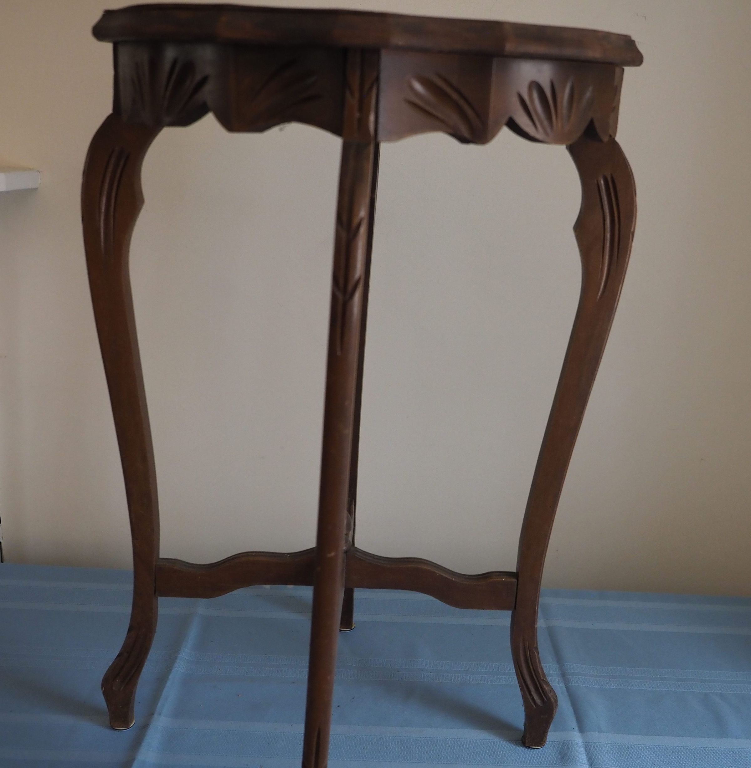 Wood end table, scalloped top edge, 4 scroll legs with cross brace