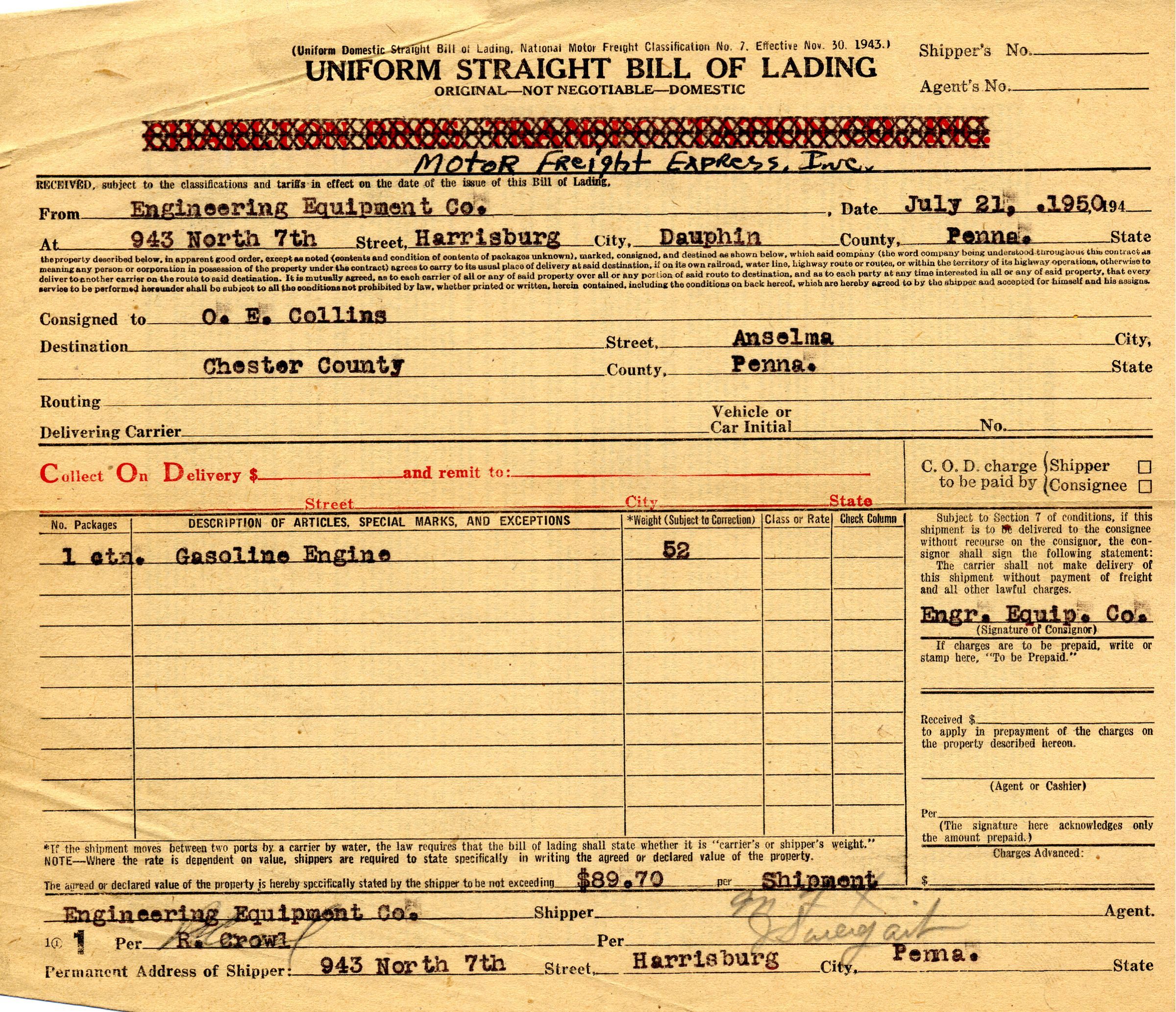 Bill for 1 ctn. Gasoline Engine (52 lbs.) July 21, 1950