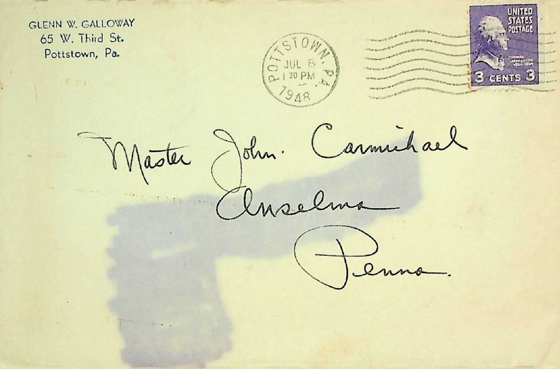 Envelope addressed to Master John Carmichael from Glenn Galloway postmarked July 8, 1948