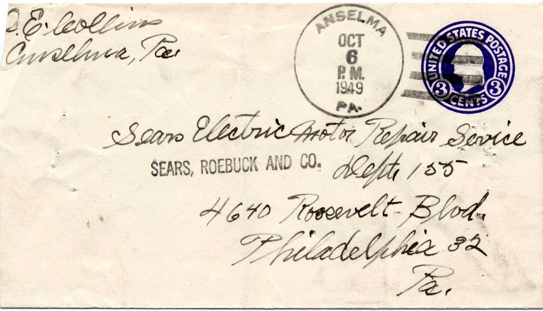 Envelope post marked at the Anselma Post Office, 10/6/1949 to Sears Electric Motor Repair Co. it does not appear that it was ever sent!Context