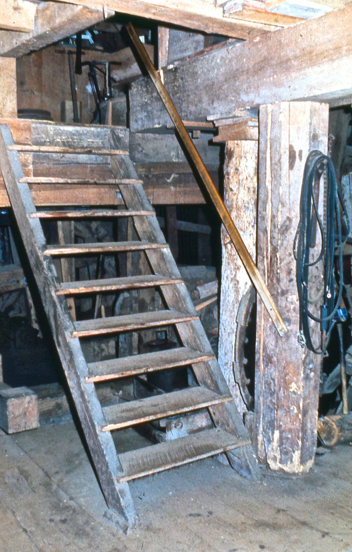 Photo of first floor stairs showing support for jacked up main beamPhotograph Details