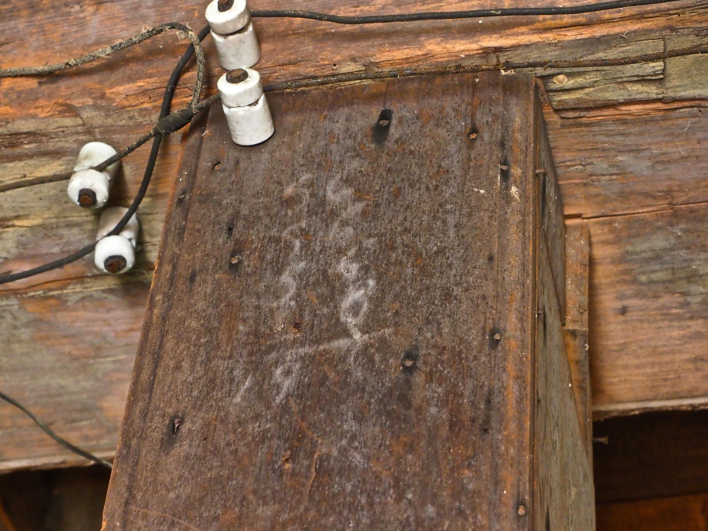Addition written in what looks like chalk on a vertical post to the right of steps leading to the third floor.