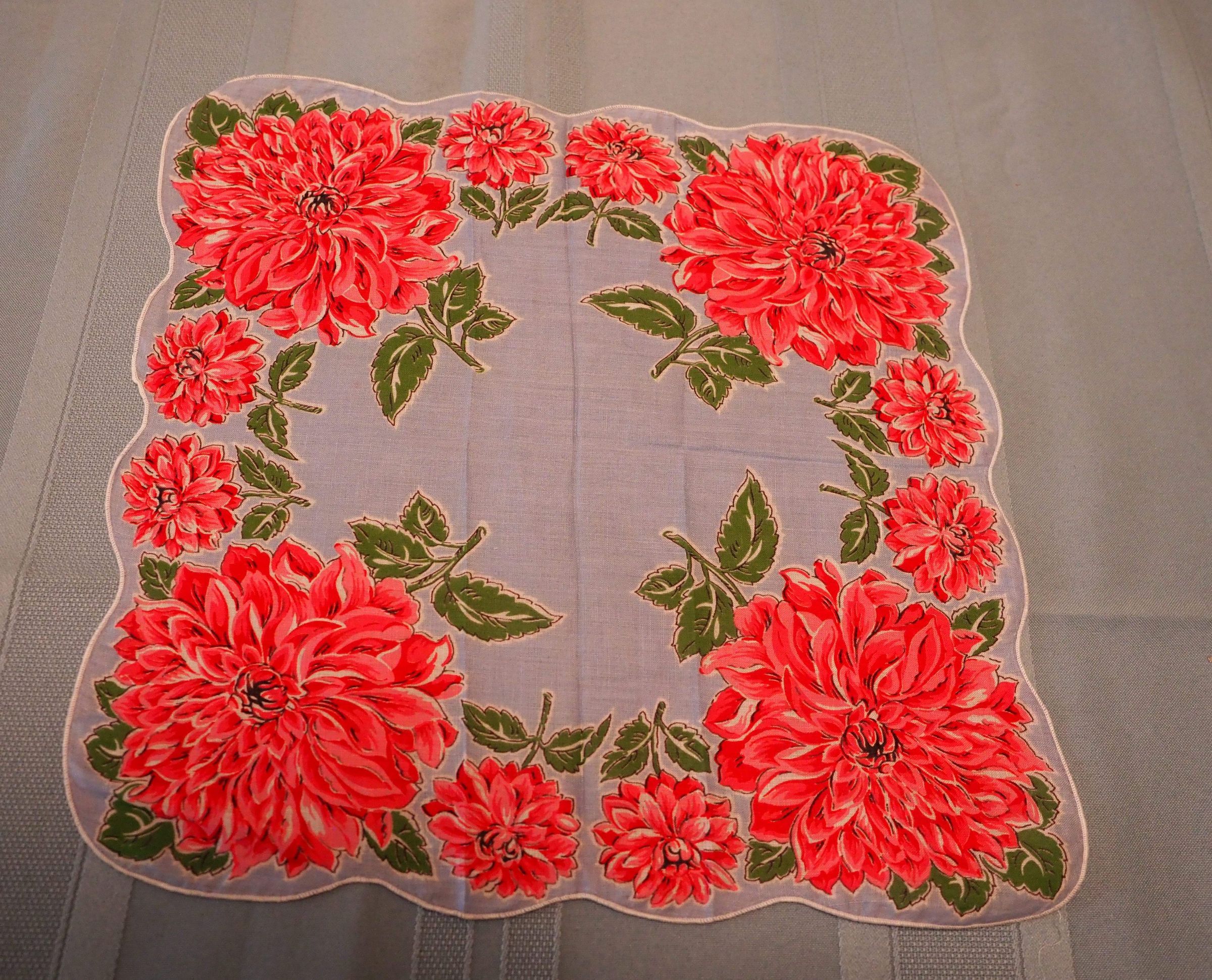 Cotton with red, blue, and green floral print, scalloped edges