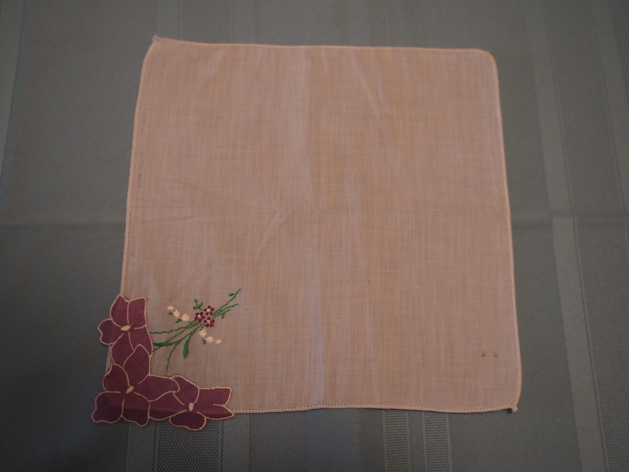 White linen with embroidered lilac and purple flower applique in corner