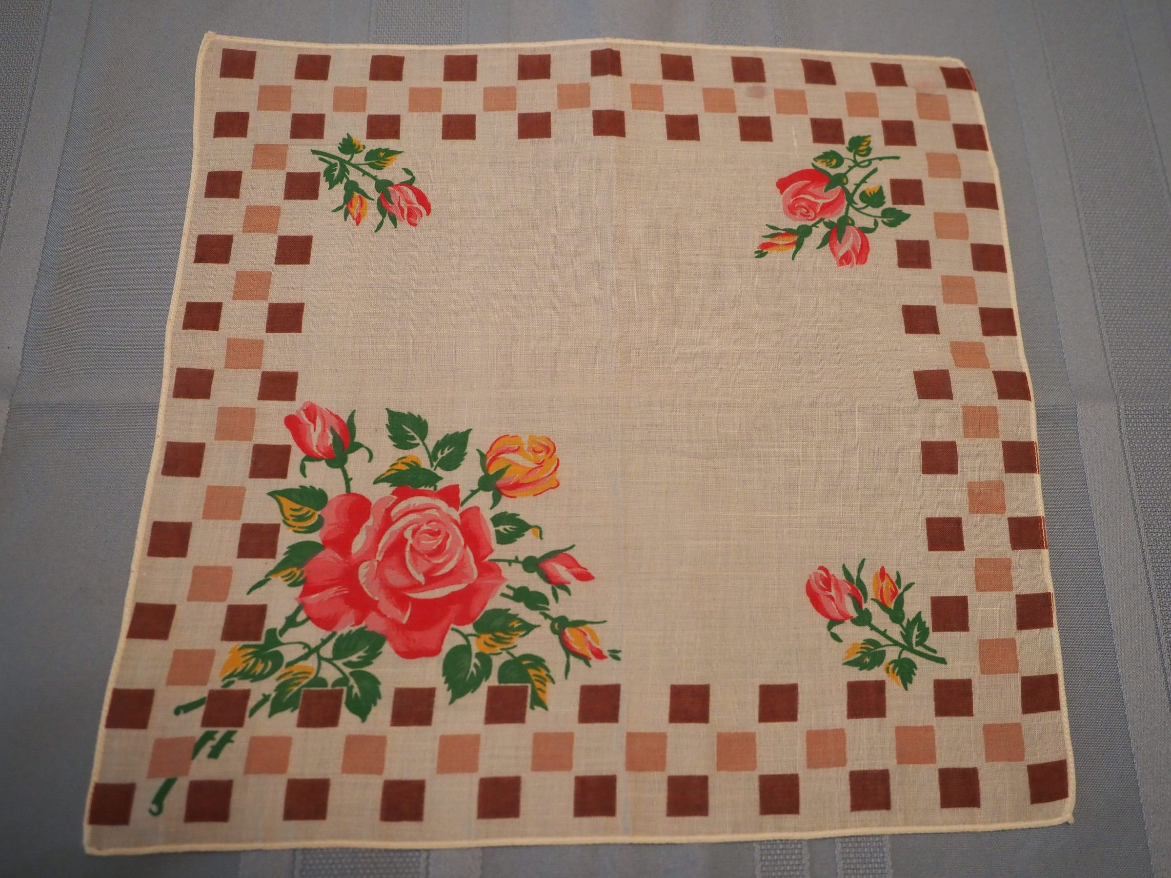 Linen with brown check border and turquoise printed roses