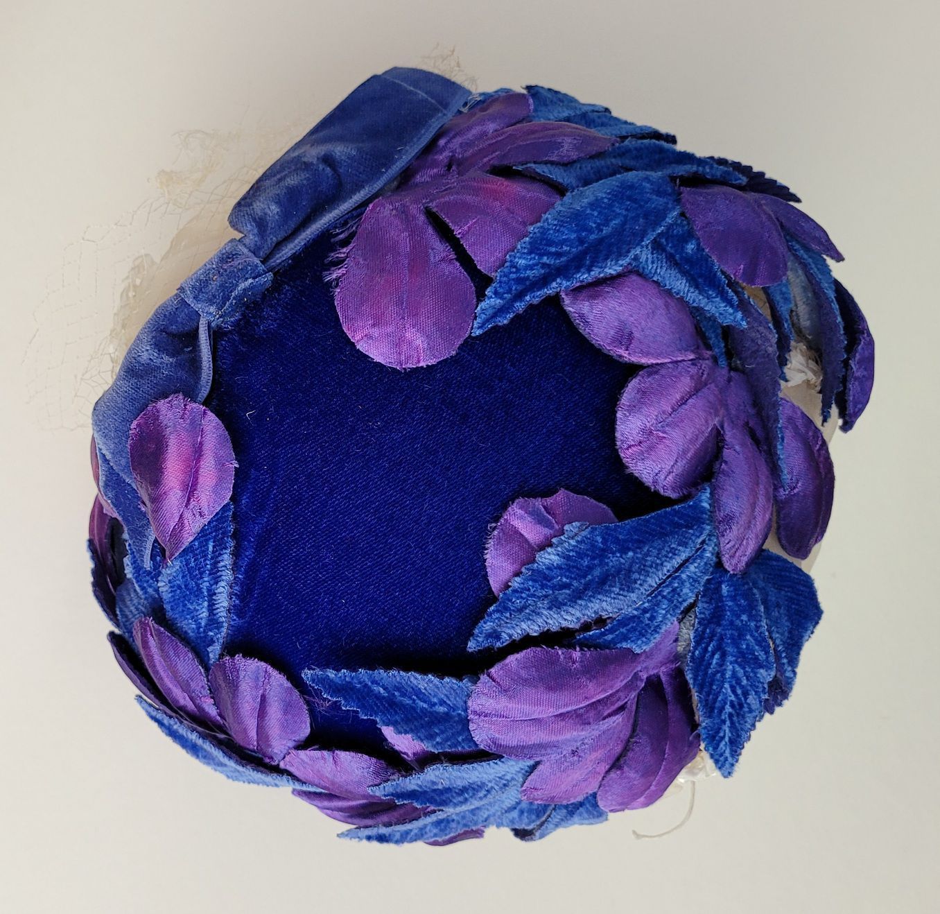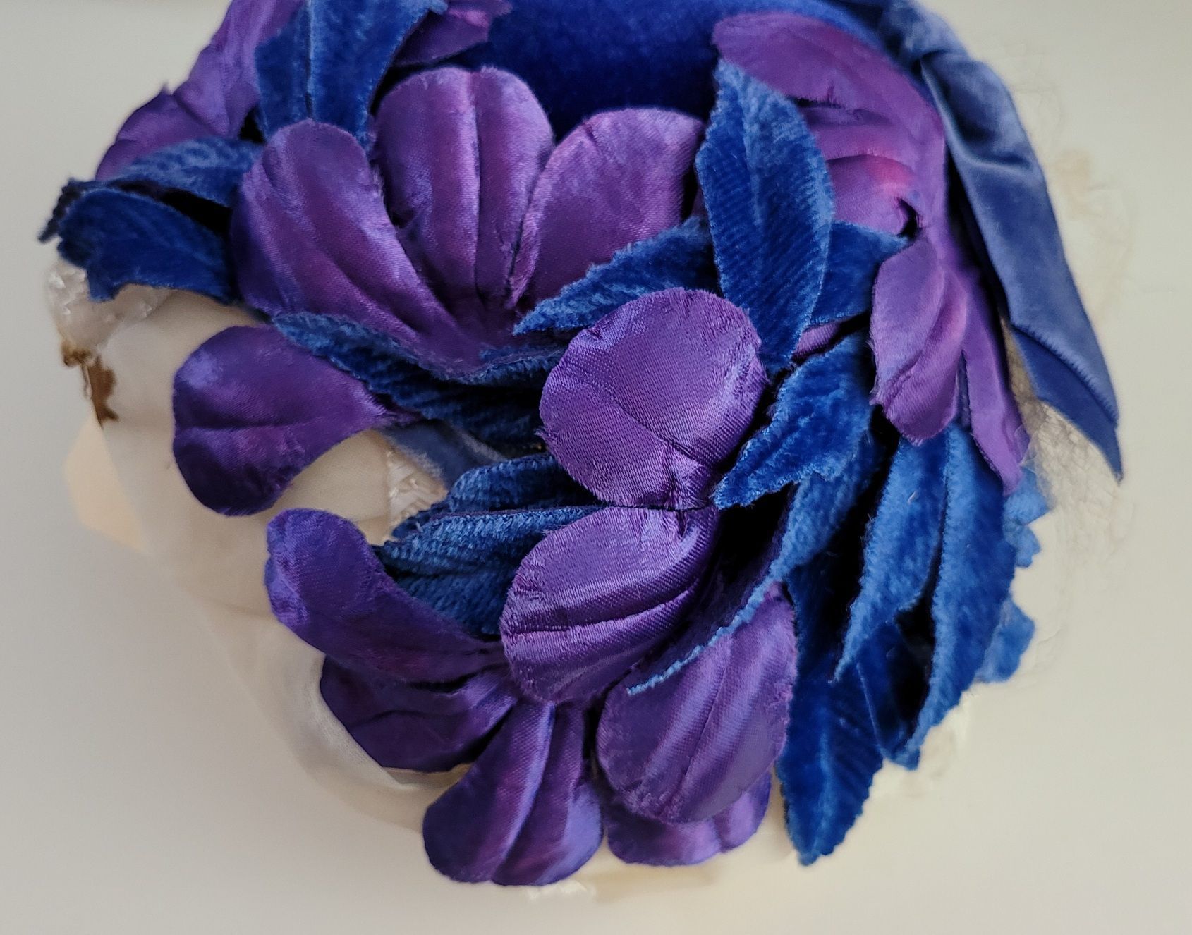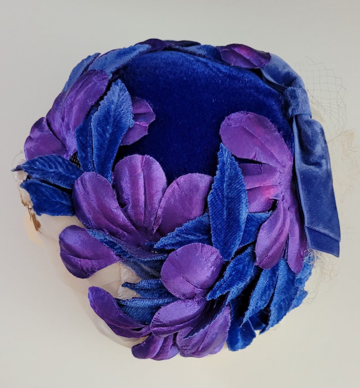 Ladies hat with purple and blue velvet and satin flowers and blue bow, over formed white helmetLabel/Inscription/Signature